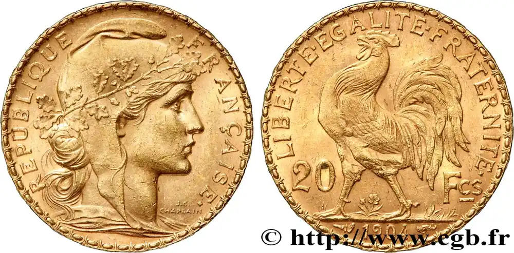 Type : 20 francs or Coq, Dieu protège la FranceDate : 1905Nom de l’atelier/ville : ParisQuantité frappée : 9158132Métal : orTitre en millième : 900 ‰Diamètre : 21 mmAxe des coins : 6 h.Poids : 6,45 g.Tranche : inscrite en relief +* DIEU *+ +* PROTEGE *+ +* LA FRANCE *+Référence ouvrage :Classement FRANC 2023 / FRANC 2023 classificationF.534/10AversTitulature avers : REPUBLIQUE – FRANÇAISE..Description avers : Buste de Marianne drapée à droite, coiffée du bonnet phrygien décoré d’une branche de chêne ; signé J.C. CHAPLAIN devant le cou.ReversTitulature revers : LIBERTE EGALITE FRATERNITE// 20 – FCS// 1905.Description revers : Coq passant à gauche, date à l’exergue.HistoriqueOR, PALLADIUM ET PLATINE INVESTISSEMENTSécurisez et diversifiez votre épargne avec les métaux précieux :Dans un contexte d’instabilité politique et économique croissante, diversifier son épargne peut être une démarche judicieuse. Les métaux précieux comme l’or, le palladium et le platine constituent des actifs tangibles souvent prisés en raison de leur caractère intemporel et de leur résilience face aux fluctuations des marchés.Pour répondre à des besoins variés, l’achat de pièces officielles en or, palladium ou platine est une option flexible et adaptée. Ces pièces, disponibles à l’unité ou en lot, permettent à chacun d’ajuster ses choix selon ses objectifs et son budget, sans engagement à long terme.Un processus simple et sécurisé :Nous proposons une livraison sécurisée et garantie. Les paiements peuvent être effectués par carte bancaire ou par virement, bien que certaines transactions puissent nécessiter un règlement exclusivement par virement bancaire. Une pièce d’identité valide (carte nationale d’identité ou passeport) sera demandée pour finaliser votre achat.Stockage en toute sécurité et confidentialité :Le département Investissement de CGB Numismatique Paris met à votre disposition des solutions de stockage offrant une sécurité renforcée et une confidentialité optimale pour vos achats en or, palladium et platine.Contactez-nous pour plus d’informations :Pour toute question ou pour passer commande, prenez contact avec notre responsable des achats/ventes de métaux précieux : par email à [email protected] ou par téléphone. Nous mettons à votre disposition des informations générales et des services pour vous accompagner dans vos projets d’investissement.CGB Numismatique Paris agit en tant que fournisseur de métaux précieux et ne fournit aucun conseil en investissement. La valeur des métaux précieux peut fluctuer, et les performances passées ne garantissent pas les résultats futurs. L’achat de métaux précieux doit être considéré comme une stratégie de préservation de valeur plutôt qu’un investissement spéculatif. Conformément à l’article L.221-28 du Code de la consommation, le droit de rétractation ne s’applique pas aux achats d’or d’investissement, dont le prix dépend des fluctuations des marchés financiers.