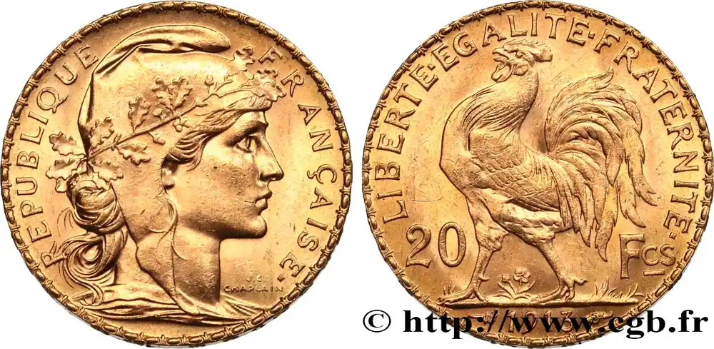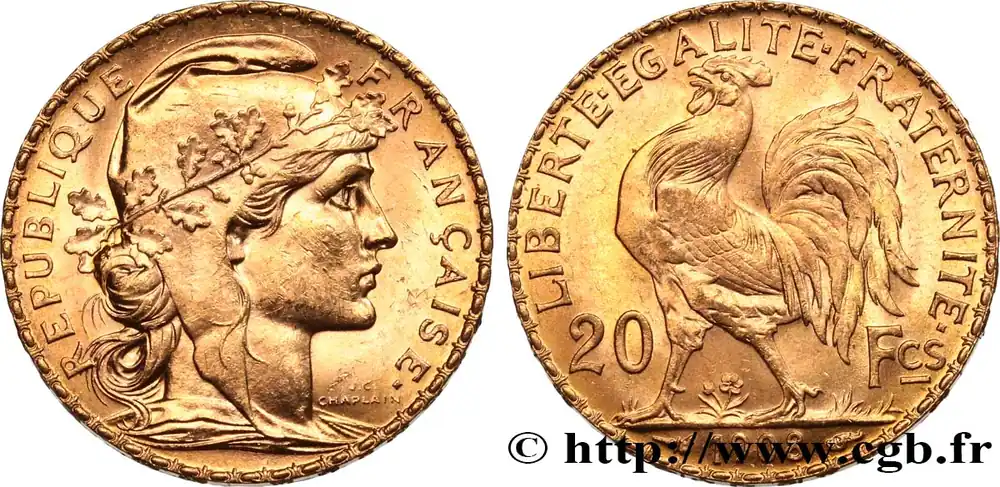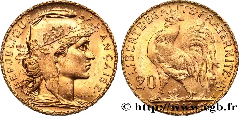 Type : 20 francs or Coq, Liberté Égalité FraternitéDate : 1909Nom de l’atelier/ville : ParisQuantité frappée : 9636955Métal : orTitre en millième : 900 ‰Diamètre : 21 mmAxe des coins : 6 h.Poids : 6,45 g.Tranche : inscrite en relief +* LIBERTE +* EGALITE +* FRATERNITE *+Référence ouvrage :Classement FRANC 2023 / FRANC 2023 classificationF.535/3AversTitulature avers : REPUBLIQUE – FRANÇAISE..Description avers : Buste de Marianne drapée à droite, coiffée du bonnet phrygien décoré d’une branche de chêne ; signé J.C. CHAPLAIN devant le cou.ReversTitulature revers : LIBERTE EGALITE FRATERNITE // 20 – FCS // 1909.Description revers : Coq passant à gauche, date à l’exergue.HistoriqueOR, PALLADIUM ET PLATINE INVESTISSEMENTSécurisez et diversifiez votre épargne avec les métaux précieux :Dans un contexte d’instabilité politique et économique croissante, diversifier son épargne peut être une démarche judicieuse. Les métaux précieux comme l’or, le palladium et le platine constituent des actifs tangibles souvent prisés en raison de leur caractère intemporel et de leur résilience face aux fluctuations des marchés.Pour répondre à des besoins variés, l’achat de pièces officielles en or, palladium ou platine est une option flexible et adaptée. Ces pièces, disponibles à l’unité ou en lot, permettent à chacun d’ajuster ses choix selon ses objectifs et son budget, sans engagement à long terme.Un processus simple et sécurisé :Nous proposons une livraison sécurisée et garantie. Les paiements peuvent être effectués par carte bancaire ou par virement, bien que certaines transactions puissent nécessiter un règlement exclusivement par virement bancaire. Une pièce d’identité valide (carte nationale d’identité ou passeport) sera demandée pour finaliser votre achat.Stockage en toute sécurité et confidentialité :Le département Investissement de CGB Numismatique Paris met à votre disposition des solutions de stockage offrant une sécurité renforcée et une confidentialité optimale pour vos achats en or, palladium et platine.Contactez-nous pour plus d’informations :Pour toute question ou pour passer commande, prenez contact avec notre responsable des achats/ventes de métaux précieux : par email à [email protected] ou par téléphone. Nous mettons à votre disposition des informations générales et des services pour vous accompagner dans vos projets d’investissement.CGB Numismatique Paris agit en tant que fournisseur de métaux précieux et ne fournit aucun conseil en investissement. La valeur des métaux précieux peut fluctuer, et les performances passées ne garantissent pas les résultats futurs. L’achat de métaux précieux doit être considéré comme une stratégie de préservation de valeur plutôt qu’un investissement spéculatif. Conformément à l’article L.221-28 du Code de la consommation, le droit de rétractation ne s’applique pas aux achats d’or d’investissement, dont le prix dépend des fluctuations des marchés financiers.