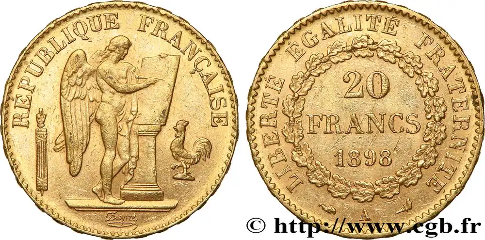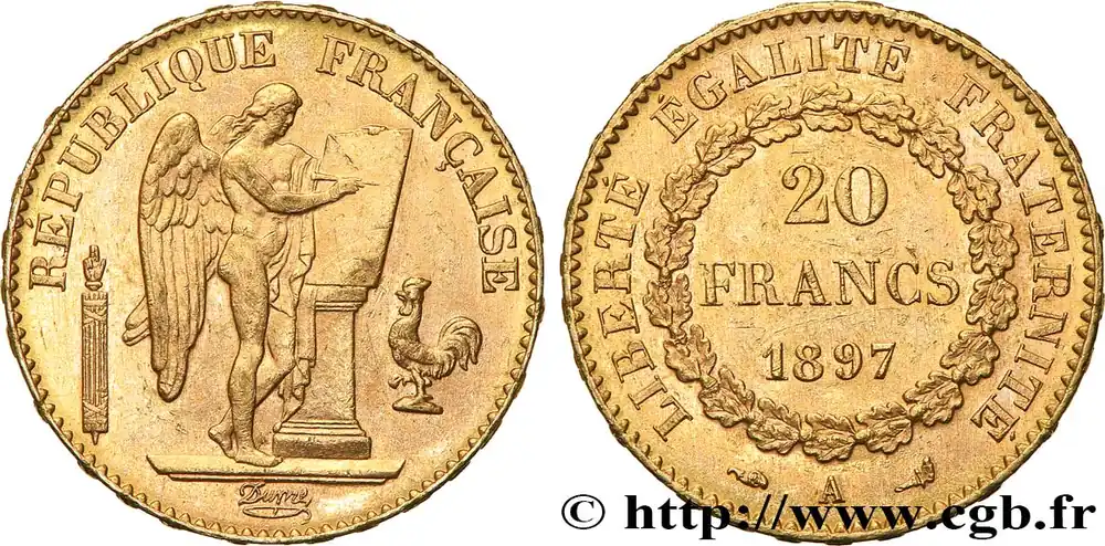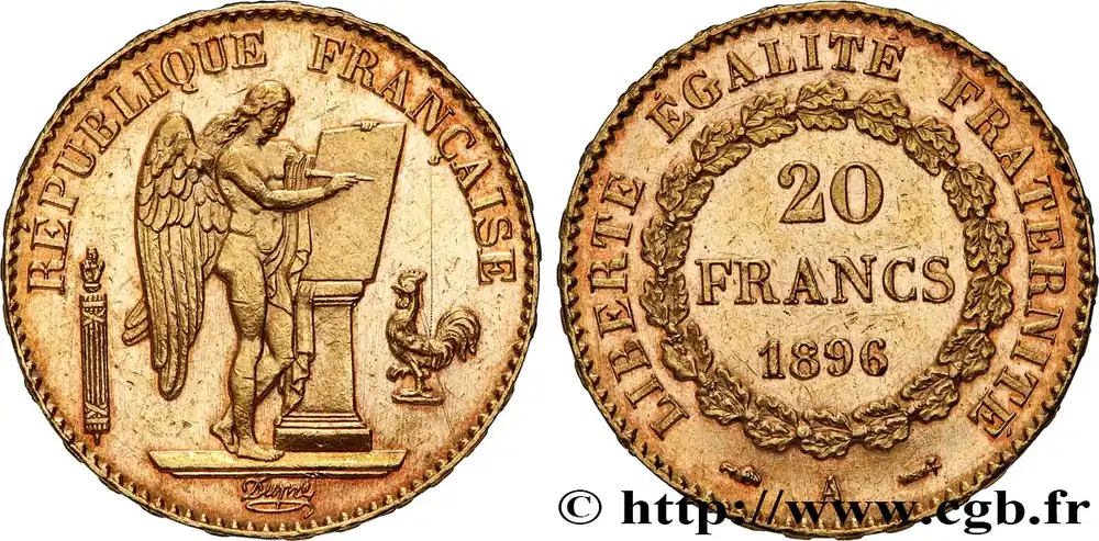 Type : 20 francs or Génie, Troisième RépubliqueDate : 1893Nom de l’atelier/ville : ParisQuantité frappée : 2547168Métal : orTitre en millième : 900 ‰Diamètre : 21 mmAxe des coins : 6 h.Poids : 6,45 g.Tranche : inscrite en relief ***** DIEU * PROTEGE * LA * FRANCECommentaires sur l’état de conservation :Multitude de petits coups, mais cet exemplaire présente de beaux reliefs et a conservé une belle partie de son brillant d’origineRéférence ouvrage :Classement FRANC 2023 / FRANC 2023 classificationF.533/17AversTitulature avers : RÉPUBLIQUE FRANÇAISE.Description avers : Génie de la République, debout à droite, gravant une Table vierge sur un cippe, accosté d’un faisceau vertical surmonté d’une main de justice à gauche et d’un coq à droite ; signé Dupré cursif au-dessous.ReversTitulature revers : LIBERTÉ ÉGALITÉ FRATERNITÉ// 20/ FRANCS/ 1893// A.Description revers : dans une couronne de chêne fermée.HistoriqueOR, PALLADIUM ET PLATINE INVESTISSEMENTSécurisez et diversifiez votre épargne avec les métaux précieux :Dans un contexte d’instabilité politique et économique croissante, diversifier son épargne peut être une démarche judicieuse. Les métaux précieux comme l’or, le palladium et le platine constituent des actifs tangibles souvent prisés en raison de leur caractère intemporel et de leur résilience face aux fluctuations des marchés.Pour répondre à des besoins variés, l’achat de pièces officielles en or, palladium ou platine est une option flexible et adaptée. Ces pièces, disponibles à l’unité ou en lot, permettent à chacun d’ajuster ses choix selon ses objectifs et son budget, sans engagement à long terme.Un processus simple et sécurisé :Nous proposons une livraison sécurisée et garantie. Les paiements peuvent être effectués par carte bancaire ou par virement, bien que certaines transactions puissent nécessiter un règlement exclusivement par virement bancaire. Une pièce d’identité valide (carte nationale d’identité ou passeport) sera demandée pour finaliser votre achat.Stockage en toute sécurité et confidentialité :Le département Investissement de CGB Numismatique Paris met à votre disposition des solutions de stockage offrant une sécurité renforcée et une confidentialité optimale pour vos achats en or, palladium et platine.Contactez-nous pour plus d’informations :Pour toute question ou pour passer commande, prenez contact avec notre responsable des achats/ventes de métaux précieux : par email à [email protected] ou par téléphone. Nous mettons à votre disposition des informations générales et des services pour vous accompagner dans vos projets d’investissement.CGB Numismatique Paris agit en tant que fournisseur de métaux précieux et ne fournit aucun conseil en investissement. La valeur des métaux précieux peut fluctuer, et les performances passées ne garantissent pas les résultats futurs. L’achat de métaux précieux doit être considéré comme une stratégie de préservation de valeur plutôt qu’un investissement spéculatif. Conformément à l’article L.221-28 du Code de la consommation, le droit de rétractation ne s’applique pas aux achats d’or d’investissement, dont le prix dépend des fluctuations des marchés financiers.