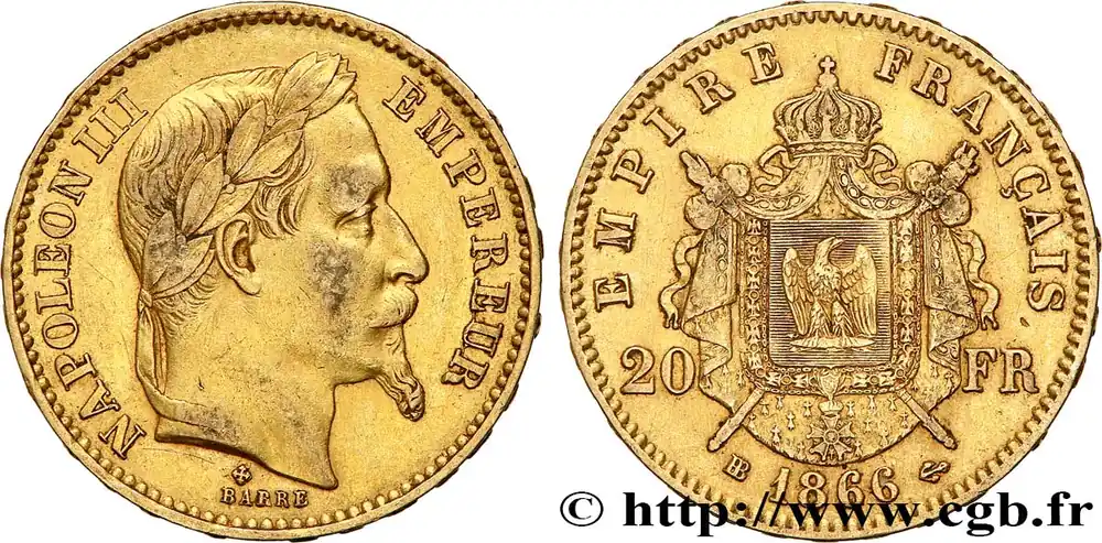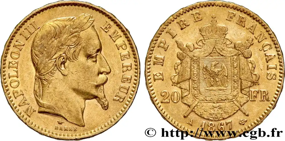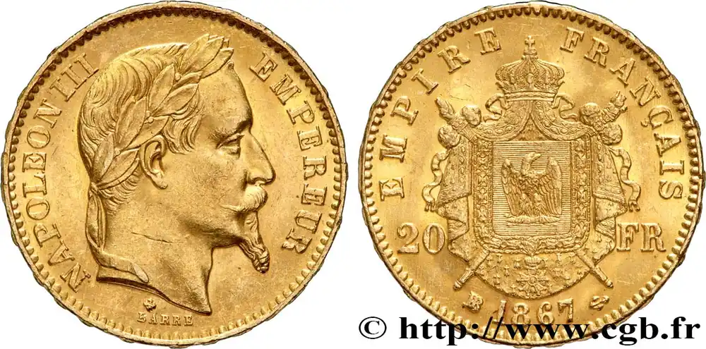 Type : 20 francs or Napoléon III, tête lauréeDate : 1863Nom de l’atelier/ville : ParisQuantité frappée : 3870706Métal : orTitre en millième : 900 ‰Diamètre : 21 mmAxe des coins : 6 h.Poids : 6,43 g.Tranche : inscrite en relief ***** DIEU* PROTEGE* LA* FRANCERéférence ouvrage :Classement FRANC 2023 / FRANC 2023 classificationF.532/6AversTitulature avers : NAPOLEON III – EMPEREUR.Description avers : Tête laurée de Napoléon III à droite ; signé BARRE au-dessous.ReversTitulature revers : EMPIRE – FRANÇAIS// 20 – FR// A 1863.Description revers : 20 – FR accostant un écu orné d’un aigle posé sur un foudre, entouré du collier de la Légion d’Honneur posé sur un manteau couronné brochant une main de Justice et un sceptre.HistoriqueOR, PALLADIUM ET PLATINE INVESTISSEMENTSécurisez et diversifiez votre épargne avec les métaux précieux :Dans un contexte d’instabilité politique et économique croissante, diversifier son épargne peut être une démarche judicieuse. Les métaux précieux comme l’or, le palladium et le platine constituent des actifs tangibles souvent prisés en raison de leur caractère intemporel et de leur résilience face aux fluctuations des marchés.Pour répondre à des besoins variés, l’achat de pièces officielles en or, palladium ou platine est une option flexible et adaptée. Ces pièces, disponibles à l’unité ou en lot, permettent à chacun d’ajuster ses choix selon ses objectifs et son budget, sans engagement à long terme.Un processus simple et sécurisé :Nous proposons une livraison sécurisée et garantie. Les paiements peuvent être effectués par carte bancaire ou par virement, bien que certaines transactions puissent nécessiter un règlement exclusivement par virement bancaire. Une pièce d’identité valide (carte nationale d’identité ou passeport) sera demandée pour finaliser votre achat.Stockage en toute sécurité et confidentialité :Le département Investissement de CGB Numismatique Paris met à votre disposition des solutions de stockage offrant une sécurité renforcée et une confidentialité optimale pour vos achats en or, palladium et platine.Contactez-nous pour plus d’informations :Pour toute question ou pour passer commande, prenez contact avec notre responsable des achats/ventes de métaux précieux : par email à [email protected] ou par téléphone. Nous mettons à votre disposition des informations générales et des services pour vous accompagner dans vos projets d’investissement.CGB Numismatique Paris agit en tant que fournisseur de métaux précieux et ne fournit aucun conseil en investissement. La valeur des métaux précieux peut fluctuer, et les performances passées ne garantissent pas les résultats futurs. L’achat de métaux précieux doit être considéré comme une stratégie de préservation de valeur plutôt qu’un investissement spéculatif. Conformément à l’article L.221-28 du Code de la consommation, le droit de rétractation ne s’applique pas aux achats d’or d’investissement, dont le prix dépend des fluctuations des marchés financiers.