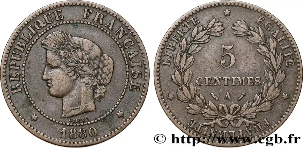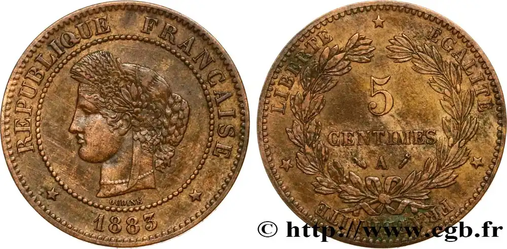 Type : 5 centimes CérèsDate : 1874Nom de l’atelier/ville : BordeauxQuantité frappée : 1.141.340Métal : bronzeDiamètre : 25 mmAxe des coins : 6 h.Poids : 5 g.Tranche : lisseSlabPCGS : MS66Commentaires sur l’état de conservation :Sous coque PCGS MS66RDRéférence ouvrage :Classement FRANC 2023 / FRANC 2023 classificationF.118/10AversTitulature avers : REPUBLIQUE FRANÇAISE // * (MILLÉSIME) *.Description avers : tête de la République à gauche en Cérès, déesse des moissons, portant un collier de perles, un double chignon et une couronne composite de blé, fleurs, olivier et olives, chêne et glands, nouée par un ruban descendant sur le cou et passant sur le front où est inscrit le mot CONCOR ; sous la tranche du cou le long du grènetis OUDINÉ, le tout dans un grènetis.ReversTitulature revers : LIBERTÉ * ÉGALITÉ * FRATERNITÉ *.Description revers : 5 CENTIMES, en deux lignes dans le champ, au-dessus de la lettre d’atelier encadrée des différents, dans une couronne nouée par un ruban à sa base, formée à gauche d’une branche de laurier, à droite d’une branche d’olivier.CommentaireDe qualité équivalente à l’actuel exemplaire de la Collection Idéale.HistoriqueTROISIÈME RÉPUBLIQUE(4/09/1870-10/07/1940) La nouvelle de la capitulation de Sedan provoque la révolution du 4 septembre 1870 à Paris. Proclamée à l’Hôtel de Ville, la République est dotée d’un gouvernement provisoire appelé gouvernement de la Défense nationale. Menacé à gauche par l’insurrection de la Commune et à droite par les monarchistes, le nouveau régime connaît des débuts difficiles. Chef du pouvoir exécutif dans un premier temps (février 1871), Thiers est chargé de réorganiser le pays avant de choisir sa forme de gouvernement. Il devient président de la République en août 1871 et, malgré son action de libération du territoire, doit quitter son poste en mars 1873 face à l’opposition royaliste. Il est alors remplacé par Mac-Mahon favorable au rétablissement de la monarchie mais celle-ci n’est pas restaurée à la suite de la question du drapeau. La loi du septennat est alors mise en place en novembre 1873 puis, en 1875, sont votées les lois fondamentales qui servent de Constitution à la Troisième République. Régime parlementaire, elle se caractérise notamment par la nette prépondérance du pouvoir législatif sur le pouvoir exécutif. Anticléricale, la Troisième République rend l’école gratuite, laïque et obligatoire mais continue la politique coloniale pour ses ambitions économiques, stratégiques et morales. La séparation des Églises et de l’État est votée en 1905. L’idée d’une revanche sur l’Allemagne et un nationalisme important sont au cœur de la crise boulangiste, du scandale de Panama ou de l’affaire Dreyfus des années 1886-1899 tandis que la politique étrangère est très active notamment au Maroc et que la course aux armements se développe. La Première Guerre mondiale coûte cher à la France qui ne se relève qu’à partir de 1920 voire 1928 pour la monnaie avec le franc « Poincaré ». La crise de 1929 ne se fait sentir qu’à partir de 1932 mais dure jusqu’en 1939, période durant laquelle l’instabilité ministérielle est très importante. Vacillant en 1934, la Troisième République trouve un nouveau ciment unitaire avec l’antifascisme qui permet l’arrivée au pouvoir du Front populaire en 1936. Mais, paralysée face à l’Allemagne, la France va alors s’enliser dans une « drôle de guerre » puis connaître l’une des plus grandes défaites de son histoire en juin 1940. Réunies en Assemblée nationale à Vichy le 10 juillet 1940, les Chambres, pourtant élues en 1936, votent les pleins pouvoirs à Pétain dans une sorte de suicide collectif par 569 voix pour, 80 voix contre et 18 abstentions.