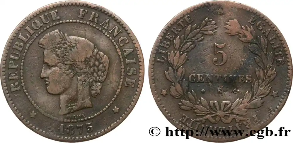 Type : 5 centimes CérèsDate : 1875Nom de l’atelier/ville : BordeauxQuantité frappée : 760000Métal : bronzeDiamètre : 25 mmAxe des coins : 6 h.Poids : 4,71 g.Tranche : lisseDegré de rareté : R1Référence ouvrage :Classement FRANC 2023 / FRANC 2023 classificationF.118/12AversTitulature avers : REPUBLIQUE FRANÇAISE// *1875*.Description avers : Tête de Cérès à gauche couronnée d’épis avec un bandeau inscrit CONCOR ; au-dessous signé OUDINÉ.ReversTitulature revers : *LIBERTÉ* ÉGALITÉ* FRATERNITÉ.Description revers : 5/ CENTIMES/ K dans une couronne formée d’une branche d’olivier et d’une branche de laurier.HistoriqueTROISIÈME RÉPUBLIQUE(4/09/1870-10/07/1940) La nouvelle de la capitulation de Sedan provoque la révolution du 4 septembre 1870 à Paris. Proclamée à l’Hôtel de Ville, la République est dotée d’un gouvernement provisoire appelé gouvernement de la Défense nationale. Menacé à gauche par l’insurrection de la Commune et à droite par les monarchistes, le nouveau régime connaît des débuts difficiles. Chef du pouvoir exécutif dans un premier temps (février 1871), Thiers est chargé de réorganiser le pays avant de choisir sa forme de gouvernement. Il devient président de la République en août 1871 et, malgré son action de libération du territoire, doit quitter son poste en mars 1873 face à l’opposition royaliste. Il est alors remplacé par Mac-Mahon favorable au rétablissement de la monarchie mais celle-ci n’est pas restaurée à la suite de la question du drapeau. La loi du septennat est alors mise en place en novembre 1873 puis, en 1875, sont votées les lois fondamentales qui servent de Constitution à la Troisième République. Régime parlementaire, elle se caractérise notamment par la nette prépondérance du pouvoir législatif sur le pouvoir exécutif. Anticléricale, la Troisième République rend l’école gratuite, laïque et obligatoire mais continue la politique coloniale pour ses ambitions économiques, stratégiques et morales. La séparation des Églises et de l’État est votée en 1905. L’idée d’une revanche sur l’Allemagne et un nationalisme important sont au cœur de la crise boulangiste, du scandale de Panama ou de l’affaire Dreyfus des années 1886-1899 tandis que la politique étrangère est très active notamment au Maroc et que la course aux armements se développe. La Première Guerre mondiale coûte cher à la France qui ne se relève qu’à partir de 1920 voire 1928 pour la monnaie avec le franc « Poincaré ». La crise de 1929 ne se fait sentir qu’à partir de 1932 mais dure jusqu’en 1939, période durant laquelle l’instabilité ministérielle est très importante. Vacillant en 1934, la Troisième République trouve un nouveau ciment unitaire avec l’antifascisme qui permet l’arrivée au pouvoir du Front populaire en 1936. Mais, paralysée face à l’Allemagne, la France va alors s’enliser dans une « drôle de guerre » puis connaître l’une des plus grandes défaites de son histoire en juin 1940. Réunies en Assemblée nationale à Vichy le 10 juillet 1940, les Chambres, pourtant élues en 1936, votent les pleins pouvoirs à Pétain dans une sorte de suicide collectif par 569 voix pour, 80 voix contre et 18 abstentions.