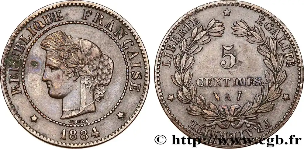 Type : 5 centimes CérèsDate : 1875Nom de l’atelier/ville : BordeauxQuantité frappée : 760000Métal : bronzeDiamètre : 25 mmAxe des coins : 6 h.Poids : 4,89 g.Tranche : lisseDegré de rareté : R1Référence ouvrage :Classement FRANC 2023 / FRANC 2023 classificationF.118/12AversTitulature avers : REPUBLIQUE FRANÇAISE// *1875*.Description avers : Tête de Cérès à gauche couronnée d’épis avec un bandeau inscrit CONCOR ; au-dessous signé OUDINÉ.ReversTitulature revers : *LIBERTÉ* ÉGALITÉ* FRATERNITÉ.Description revers : 5/ CENTIMES/ K dans une couronne formée d’une branche d’olivier et d’une branche de laurier.HistoriqueTROISIÈME RÉPUBLIQUE(4/09/1870-10/07/1940) La nouvelle de la capitulation de Sedan provoque la révolution du 4 septembre 1870 à Paris. Proclamée à l’Hôtel de Ville, la République est dotée d’un gouvernement provisoire appelé gouvernement de la Défense nationale. Menacé à gauche par l’insurrection de la Commune et à droite par les monarchistes, le nouveau régime connaît des débuts difficiles. Chef du pouvoir exécutif dans un premier temps (février 1871), Thiers est chargé de réorganiser le pays avant de choisir sa forme de gouvernement. Il devient président de la République en août 1871 et, malgré son action de libération du territoire, doit quitter son poste en mars 1873 face à l’opposition royaliste. Il est alors remplacé par Mac-Mahon favorable au rétablissement de la monarchie mais celle-ci n’est pas restaurée à la suite de la question du drapeau. La loi du septennat est alors mise en place en novembre 1873 puis, en 1875, sont votées les lois fondamentales qui servent de Constitution à la Troisième République. Régime parlementaire, elle se caractérise notamment par la nette prépondérance du pouvoir législatif sur le pouvoir exécutif. Anticléricale, la Troisième République rend l’école gratuite, laïque et obligatoire mais continue la politique coloniale pour ses ambitions économiques, stratégiques et morales. La séparation des Églises et de l’État est votée en 1905. L’idée d’une revanche sur l’Allemagne et un nationalisme important sont au cœur de la crise boulangiste, du scandale de Panama ou de l’affaire Dreyfus des années 1886-1899 tandis que la politique étrangère est très active notamment au Maroc et que la course aux armements se développe. La Première Guerre mondiale coûte cher à la France qui ne se relève qu’à partir de 1920 voire 1928 pour la monnaie avec le franc « Poincaré ». La crise de 1929 ne se fait sentir qu’à partir de 1932 mais dure jusqu’en 1939, période durant laquelle l’instabilité ministérielle est très importante. Vacillant en 1934, la Troisième République trouve un nouveau ciment unitaire avec l’antifascisme qui permet l’arrivée au pouvoir du Front populaire en 1936. Mais, paralysée face à l’Allemagne, la France va alors s’enliser dans une « drôle de guerre » puis connaître l’une des plus grandes défaites de son histoire en juin 1940. Réunies en Assemblée nationale à Vichy le 10 juillet 1940, les Chambres, pourtant élues en 1936, votent les pleins pouvoirs à Pétain dans une sorte de suicide collectif par 569 voix pour, 80 voix contre et 18 abstentions.
