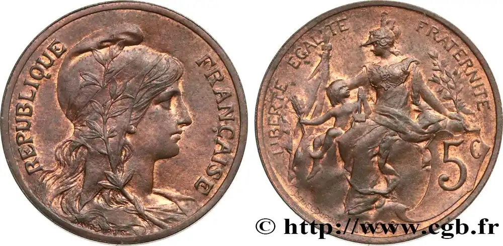 Type : 5 centimes Daniel-DupuisDate : 1909Quantité frappée : 8000000Métal : bronzeDiamètre : 25 mmAxe des coins : 6 h.Poids : 5 g.Tranche : lisse SlabGENI : MS65Commentaires sur l’état de conservation :Sous coque GENI MS65RDRéférence ouvrage :Classement FRANC 2023 / FRANC 2023 classificationF.119/20AversTitulature avers : REPUBLIQUE – FRANCAISE.Description avers : Buste de la Liberté à droite, coiffée du bonnet phrygien orné d’une couronne ; signé au-dessous en creux DANIEL DUPUIS.ReversTitulature revers : LIBERTE EGALITE – FRATERNITE// 5 C DANS UN CARTOUCHE// DANIEL DUPUIS EN CREUX ET LE MILLÉSIME.Description revers : La République cuirassée et drapée, assise à gauche sur un rocher tenant de sa main droite un drapeau-étendard et de sa main gauche une branche d’olivier ; à sa droite un enfant tenant des épis de blé et un marteau.HistoriqueTROISIÈME RÉPUBLIQUE(4/09/1870-10/07/1940) La nouvelle de la capitulation de Sedan provoque la révolution du 4 septembre 1870 à Paris. Proclamée à l’Hôtel de Ville, la République est dotée d’un gouvernement provisoire appelé gouvernement de la Défense nationale. Menacé à gauche par l’insurrection de la Commune et à droite par les monarchistes, le nouveau régime connaît des débuts difficiles. Chef du pouvoir exécutif dans un premier temps (février 1871), Thiers est chargé de réorganiser le pays avant de choisir sa forme de gouvernement. Il devient président de la République en août 1871 et, malgré son action de libération du territoire, doit quitter son poste en mars 1873 face à l’opposition royaliste. Il est alors remplacé par Mac-Mahon favorable au rétablissement de la monarchie mais celle-ci n’est pas restaurée à la suite de la question du drapeau. La loi du septennat est alors mise en place en novembre 1873 puis, en 1875, sont votées les lois fondamentales qui servent de Constitution à la Troisième République. Régime parlementaire, elle se caractérise notamment par la nette prépondérance du pouvoir législatif sur le pouvoir exécutif. Anticléricale, la Troisième République rend l’école gratuite, laïque et obligatoire mais continue la politique coloniale pour ses ambitions économiques, stratégiques et morales. La séparation des Églises et de l’État est votée en 1905. L’idée d’une revanche sur l’Allemagne et un nationalisme important sont au cœur de la crise boulangiste, du scandale de Panama ou de l’affaire Dreyfus des années 1886-1899 tandis que la politique étrangère est très active notamment au Maroc et que la course aux armements se développe. La Première Guerre mondiale coûte cher à la France qui ne se relève qu’à partir de 1920 voire 1928 pour la monnaie avec le franc « Poincaré ». La crise de 1929 ne se fait sentir qu’à partir de 1932 mais dure jusqu’en 1939, période durant laquelle l’instabilité ministérielle est très importante. Vacillant en 1934, la Troisième République trouve un nouveau ciment unitaire avec l’antifascisme qui permet l’arrivée au pouvoir du Front populaire en 1936. Mais, paralysée face à l’Allemagne, la France va alors s’enliser dans une « drôle de guerre » puis connaître l’une des plus grandes défaites de son histoire en juin 1940. Réunies en Assemblée nationale à Vichy le 10 juillet 1940, les Chambres, pourtant élues en 1936, votent les pleins pouvoirs à Pétain dans une sorte de suicide collectif par 569 voix pour, 80 voix contre et 18 abstentions.