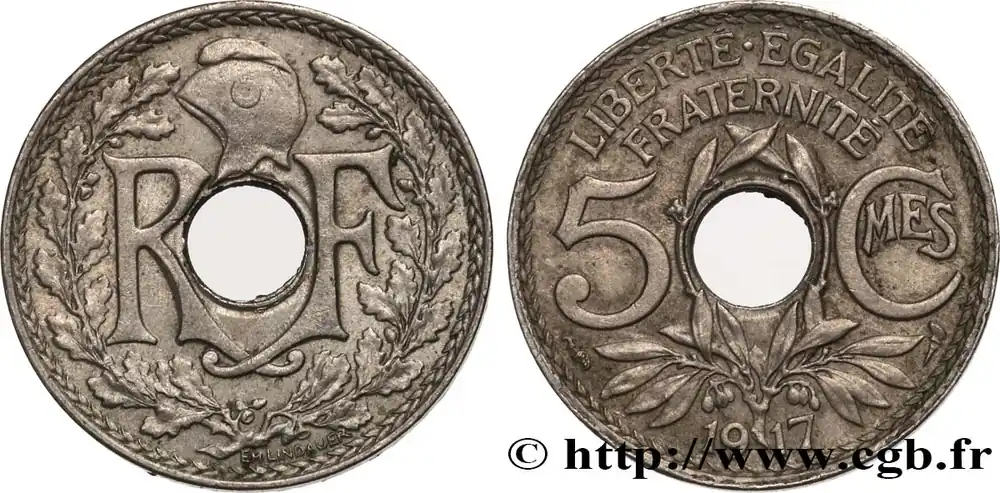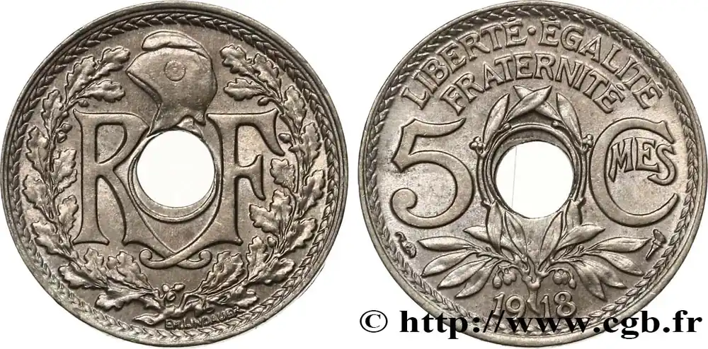 Type : 5 centimes Lindauer, grand moduleDate : 1918Nom de l’atelier/ville : ParisQuantité frappée : 33591616Métal : cupro-nickelDiamètre : 19 mmAxe des coins : 6 h.Poids : 3,02 g.Tranche : lisseRéférence ouvrage :Classement FRANC 2023 / FRANC 2023 classificationF.121/2AversTitulature avers : R-F AUTOUR D’UN ROND PERFORÉ.Description avers : Bonnet phrygien à gauche orné d’une cocarde, dans une couronne formée de deux branches de chêne nouées par un ruban ; signé au-dessous EM LINDAUER.ReversTitulature revers : LIBERTÉ. ÉGALITÉ / FRATERNITÉ / 5 – CMES / (MILLÉSIME).Description revers : Branche d’olivier entourant un rond perforé.HistoriqueTROISIÈME RÉPUBLIQUE(4/09/1870-10/07/1940) La nouvelle de la capitulation de Sedan provoque la révolution du 4 septembre 1870 à Paris. Proclamée à l’Hôtel de Ville, la République est dotée d’un gouvernement provisoire appelé gouvernement de la Défense nationale. Menacé à gauche par l’insurrection de la Commune et à droite par les monarchistes, le nouveau régime connaît des débuts difficiles. Chef du pouvoir exécutif dans un premier temps (février 1871), Thiers est chargé de réorganiser le pays avant de choisir sa forme de gouvernement. Il devient président de la République en août 1871 et, malgré son action de libération du territoire, doit quitter son poste en mars 1873 face à l’opposition royaliste. Il est alors remplacé par Mac-Mahon favorable au rétablissement de la monarchie mais celle-ci n’est pas restaurée à la suite de la question du drapeau. La loi du septennat est alors mise en place en novembre 1873 puis, en 1875, sont votées les lois fondamentales qui servent de Constitution à la Troisième République. Régime parlementaire, elle se caractérise notamment par la nette prépondérance du pouvoir législatif sur le pouvoir exécutif. Anticléricale, la Troisième République rend l’école gratuite, laïque et obligatoire mais continue la politique coloniale pour ses ambitions économiques, stratégiques et morales. La séparation des Églises et de l’État est votée en 1905. L’idée d’une revanche sur l’Allemagne et un nationalisme important sont au cœur de la crise boulangiste, du scandale de Panama ou de l’affaire Dreyfus des années 1886-1899 tandis que la politique étrangère est très active notamment au Maroc et que la course aux armements se développe. La Première Guerre mondiale coûte cher à la France qui ne se relève qu’à partir de 1920 voire 1928 pour la monnaie avec le franc « Poincaré ». La crise de 1929 ne se fait sentir qu’à partir de 1932 mais dure jusqu’en 1939, période durant laquelle l’instabilité ministérielle est très importante. Vacillant en 1934, la Troisième République trouve un nouveau ciment unitaire avec l’antifascisme qui permet l’arrivée au pouvoir du Front populaire en 1936. Mais, paralysée face à l’Allemagne, la France va alors s’enliser dans une « drôle de guerre » puis connaître l’une des plus grandes défaites de son histoire en juin 1940. Réunies en Assemblée nationale à Vichy le 10 juillet 1940, les Chambres, pourtant élues en 1936, votent les pleins pouvoirs à Pétain dans une sorte de suicide collectif par 569 voix pour, 80 voix contre et 18 abstentions.