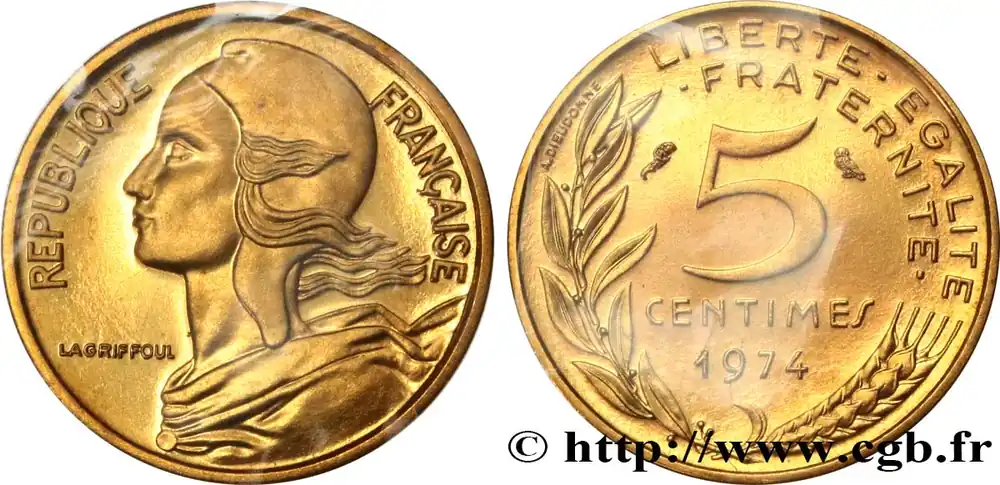 Type : 5 centimes MarianneDate : 1975Nom de l’atelier/ville : PessacQuantité frappée : 95887011Métal : bronze-aluminiumDiamètre : 17 mmAxe des coins : 6 h.Poids : 2 g.Tranche : lisseRéférence ouvrage :Classement FRANC 2023 / FRANC 2023 classificationF.125/11AversTitulature avers : REPUBLIQUE FRANÇAISE.Description avers : Buste habillé de la République aux cheveux longs à gauche, les cheveux et les rubans du col au vent, coiffée d’un bonnet phrygien ; dans le champ, devant le cou dans le champ gauche LAGRIFFOUL.ReversTitulature revers : LIBERTE – EGALITE / – FRATERNITE -.Description revers : 5 / CENTIMES en deux lignes dans le champ, encadré des différents, au-dessus de 1975, le tout contenu dans une branche de laurier et un épi de blé ; à gauche de la branche de laurier, contre le listel, A. DIEUDONNE..CommentaireExemplaire sous capsule provenant d’une série Fleurs De Coins.HistoriqueCINQUIÈME RÉPUBLIQUE(depuis le 08/01/1959) La Cinquième République, dont la constitution a été approuvée par référendum le 28 septembre 1958 par plus de 79 % des Français, ne débute officiellement qu’avec l’installation du général de Gaulle comme président le 8 janvier 1959. La constitution est modifiée le 28 octobre 1962 par référendum où une majorité de 62 % des voix approuve l’élection du président de la République au suffrage universel direct. Les différents présidents de la Ve République sont Charles de Gaulle (8/01/1959 – 27/04/1969, retrait et Alain Poher devient président par intérim), Georges Pompidou (15/06/1969 – 2/04/1974, décédé, Alain Poher devient président par intérim), Valéry Giscard d’Estaing (19/05/1974 – 21/05/1981), François Mitterrand (21/05/1981 – 7/05/1995), Jacques Chirac (7/05/1995 – 16/05/2007) , Nicolas Sarkozy (16/05/2007 – 15/05/2012), François Hollande (15/05/2012 – 14/05/2017) et Emmanuel Macron (14/05/2017 – ).
