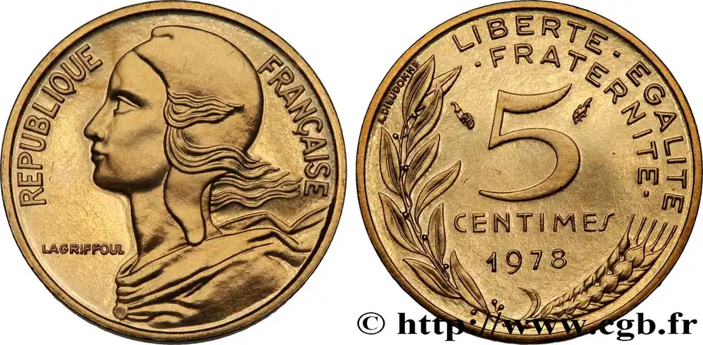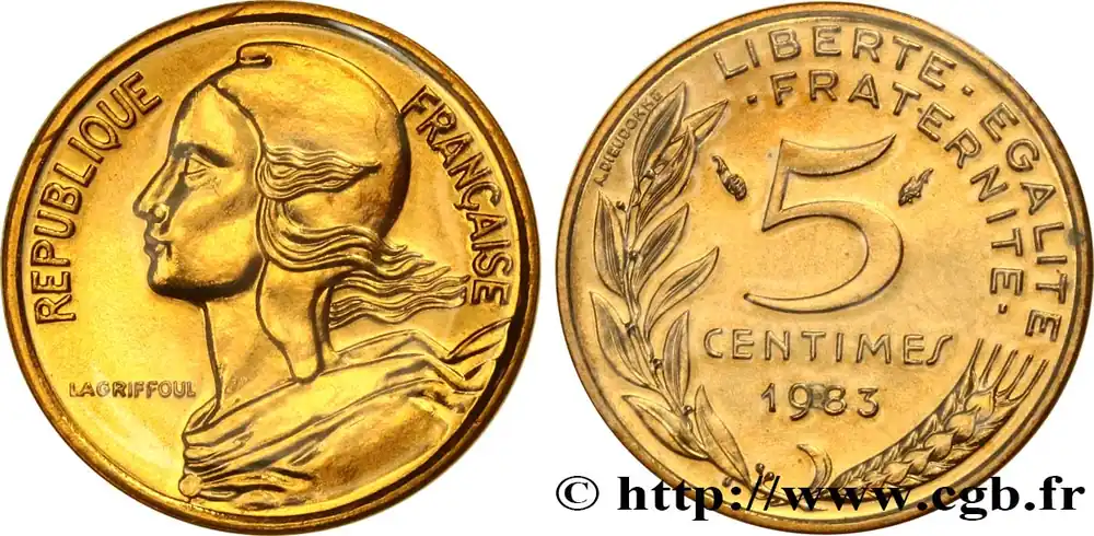 Type : 5 centimes MarianneDate : 2000Nom de l’atelier/ville : PessacQuantité frappée : 100500Métal : bronze-aluminiumDiamètre : 17 mmAxe des coins : 6 h.Poids : 2 g.Tranche : lisseRéférence ouvrage :Classement FRANC 2023 / FRANC 2023 classificationF.125/44AversTitulature avers : REPUBLIQUE FRANÇAISE.Description avers : Buste habillé de la République aux cheveux longs à gauche, les cheveux et les rubans du col au vent, coiffée d’un bonnet phrygien ; dans le champ, devant le cou dans le champ gauche LAGRIFFOUL.ReversTitulature revers : LIBERTE – EGALITE / – FRATERNITE -.Description revers : 5 / CENTIMES en deux lignes dans le champ, encadré des différents, au-dessus du millésime, le tout contenu dans une branche de laurier et un épi de blé ; à gauche de la branche de laurier, contre le listel, A. DIEUDONNE..CommentaireExemplaire encore sous plastique issu d’un coffret Brillant Universel.HistoriqueCINQUIÈME RÉPUBLIQUE(depuis le 08/01/1959) La Cinquième République, dont la constitution a été approuvée par référendum le 28 septembre 1958 par plus de 79 % des Français, ne débute officiellement qu’avec l’installation du général de Gaulle comme président le 8 janvier 1959. La constitution est modifiée le 28 octobre 1962 par référendum où une majorité de 62 % des voix approuve l’élection du président de la République au suffrage universel direct. Les différents présidents de la Ve République sont Charles de Gaulle (8/01/1959 – 27/04/1969, retrait et Alain Poher devient président par intérim), Georges Pompidou (15/06/1969 – 2/04/1974, décédé, Alain Poher devient président par intérim), Valéry Giscard d’Estaing (19/05/1974 – 21/05/1981), François Mitterrand (21/05/1981 – 7/05/1995), Jacques Chirac (7/05/1995 – 16/05/2007) , Nicolas Sarkozy (16/05/2007 – 15/05/2012), François Hollande (15/05/2012 – 14/05/2017) et Emmanuel Macron (14/05/2017 – ).