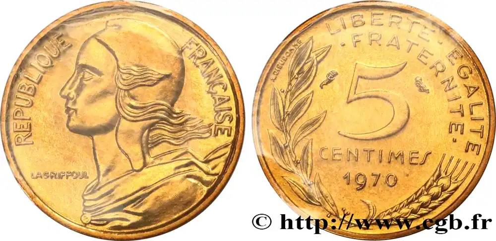 Type : 5 centimes MarianneDate : 2000Nom de l’atelier/ville : PessacQuantité frappée : 100500Métal : bronze-aluminiumDiamètre : 17 mmAxe des coins : 6 h.Poids : 2 g.Tranche : lisseRéférence ouvrage :Classement FRANC 2023 / FRANC 2023 classificationF.125/44AversTitulature avers : REPUBLIQUE FRANÇAISE.Description avers : Buste habillé de la République aux cheveux longs à gauche, les cheveux et les rubans du col au vent, coiffée d’un bonnet phrygien ; dans le champ, devant le cou dans le champ gauche LAGRIFFOUL.ReversTitulature revers : LIBERTE – EGALITE / – FRATERNITE -.Description revers : 5 / CENTIMES en deux lignes dans le champ, encadré des différents, au-dessus du millésime, le tout contenu dans une branche de laurier et un épi de blé ; à gauche de la branche de laurier, contre le listel, A. DIEUDONNE..CommentaireExemplaire encore sous plastique issu d’un coffret Brillant Universel.HistoriqueCINQUIÈME RÉPUBLIQUE(depuis le 08/01/1959) La Cinquième République, dont la constitution a été approuvée par référendum le 28 septembre 1958 par plus de 79 % des Français, ne débute officiellement qu’avec l’installation du général de Gaulle comme président le 8 janvier 1959. La constitution est modifiée le 28 octobre 1962 par référendum où une majorité de 62 % des voix approuve l’élection du président de la République au suffrage universel direct. Les différents présidents de la Ve République sont Charles de Gaulle (8/01/1959 – 27/04/1969, retrait et Alain Poher devient président par intérim), Georges Pompidou (15/06/1969 – 2/04/1974, décédé, Alain Poher devient président par intérim), Valéry Giscard d’Estaing (19/05/1974 – 21/05/1981), François Mitterrand (21/05/1981 – 7/05/1995), Jacques Chirac (7/05/1995 – 16/05/2007) , Nicolas Sarkozy (16/05/2007 – 15/05/2012), François Hollande (15/05/2012 – 14/05/2017) et Emmanuel Macron (14/05/2017 – ).