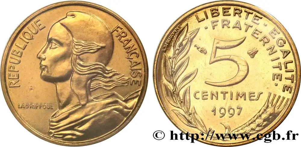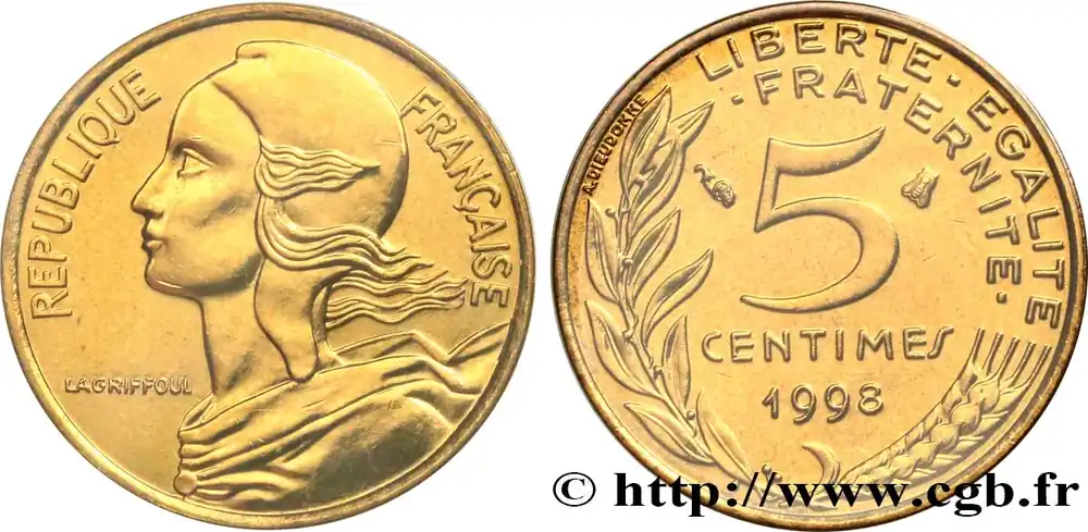 Type : 5 centimes Marianne, BU (Brillant Universel)Date : 2001Nom de l’atelier/ville : PessacQuantité frappée : 125000Métal : bronze-aluminiumDiamètre : 17 mmAxe des coins : 6 h.Tranche : lisseCommentaires sur l’état de conservation :Exemplaire sous capsule provenant d’une série FDCRéférence ouvrage :Classement FRANC 2023 / FRANC 2023 classificationF.125/45AversTitulature avers : REPUBLIQUE FRANÇAISE.Description avers : Buste habillé de la République aux cheveux longs à gauche, les cheveux et les rubans du col au vent, coiffée d’un bonnet phrygien ; dans le champ, devant le cou dans le champ gauche LAGRIFFOUL.ReversTitulature revers : LIBERTE – EGALITE / – FRATERNITE -.Description revers : 5 / CENTIMES en deux lignes dans le champ, encadré des différents, au-dessus de 2001, le tout contenu dans une branche de laurier et un épi de blé ; à gauche de la branche de laurier, contre le listel, A. DIEUDONNE..CommentaireExemplaire sous capsule provenant d’une série FDC.HistoriqueCINQUIÈME RÉPUBLIQUE(depuis le 08/01/1959) La Cinquième République, dont la constitution a été approuvée par référendum le 28 septembre 1958 par plus de 79 % des Français, ne débute officiellement qu’avec l’installation du général de Gaulle comme président le 8 janvier 1959. La constitution est modifiée le 28 octobre 1962 par référendum où une majorité de 62 % des voix approuve l’élection du président de la République au suffrage universel direct. Les différents présidents de la Ve République sont Charles de Gaulle (8/01/1959 – 27/04/1969, retrait et Alain Poher devient président par intérim), Georges Pompidou (15/06/1969 – 2/04/1974, décédé, Alain Poher devient président par intérim), Valéry Giscard d’Estaing (19/05/1974 – 21/05/1981), François Mitterrand (21/05/1981 – 7/05/1995), Jacques Chirac (7/05/1995 – 16/05/2007) , Nicolas Sarkozy (16/05/2007 – 15/05/2012), François Hollande (15/05/2012 – 14/05/2017) et Emmanuel Macron (14/05/2017 – ).