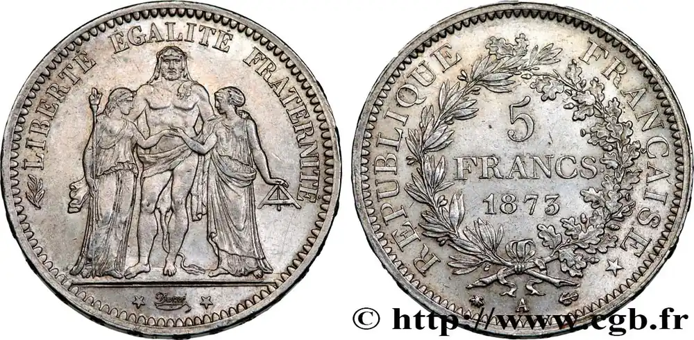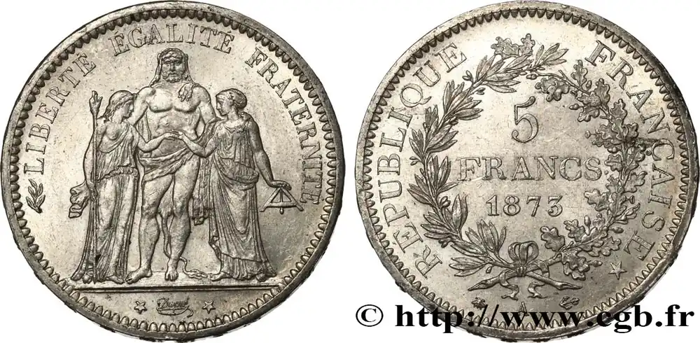 Type : 5 francs HerculeDate : 1873Nom de l’atelier/ville : ParisQuantité frappée : 27.192.181Métal : argentTitre en millième : 900 ‰Diamètre : 37 mmAxe des coins : 6 h.Poids : 24,81 g.Tranche : en relief : *****DIEU*PROTEGE*LA*FRANCERéférence ouvrage :Classement FRANC 2023 / FRANC 2023 classificationF.334/9AversTitulature avers : (RAMEAU) LIBERTÉ ÉGALITÉ FRATERNITÉ.Description avers : Hercule barbu demi-nu, debout de face avec la léonté, sur son épaule gauche une patte du lion, sur son bras et autour de sa taille la peau du lion de Némée, derrière ses jambes queue et pattes du lion, unissant la Liberté debout à gauche tournée à droite tenant une pique surmontée d’une main de Justice, vêtue d’un peplos et l’Égalité debout à droite tournée à gauche, tenant le niveau, vêtue d’un chiton : à l’exergue, Dupré en cursif entre deux étoiles.ReversTitulature revers : RÉPUBLIQUE FRANÇAISE*.Description revers : 5 / FRANCS, en deux lignes au-dessus de 1873, le tout contenu dans une couronne composée à gauche d’une branche de laurier, à droite d’une branche de chêne, nouées à leur base par un ruban ; au-dessous du nœud la lettre d’atelier A encadrée des différents.CommentaireTranche B.HistoriqueTROISIÈME RÉPUBLIQUE(4/09/1870-10/07/1940) La nouvelle de la capitulation de Sedan provoque la révolution du 4 septembre 1870 à Paris. Proclamée à l’Hôtel de Ville, la République est dotée d’un gouvernement provisoire appelé gouvernement de la Défense nationale. Menacé à gauche par l’insurrection de la Commune et à droite par les monarchistes, le nouveau régime connaît des débuts difficiles. Chef du pouvoir exécutif dans un premier temps (février 1871), Thiers est chargé de réorganiser le pays avant de choisir sa forme de gouvernement. Il devient président de la République en août 1871 et, malgré son action de libération du territoire, doit quitter son poste en mars 1873 face à l’opposition royaliste. Il est alors remplacé par Mac-Mahon favorable au rétablissement de la monarchie mais celle-ci n’est pas restaurée à la suite de la question du drapeau. La loi du septennat est alors mise en place en novembre 1873 puis, en 1875, sont votées les lois fondamentales qui servent de Constitution à la Troisième République. Régime parlementaire, elle se caractérise notamment par la nette prépondérance du pouvoir législatif sur le pouvoir exécutif. Anticléricale, la Troisième République rend l’école gratuite, laïque et obligatoire mais continue la politique coloniale pour ses ambitions économiques, stratégiques et morales. La séparation des Églises et de l’État est votée en 1905. L’idée d’une revanche sur l’Allemagne et un nationalisme important sont au cœur de la crise boulangiste, du scandale de Panama ou de l’affaire Dreyfus des années 1886-1899 tandis que la politique étrangère est très active notamment au Maroc et que la course aux armements se développe. La Première Guerre mondiale coûte cher à la France qui ne se relève qu’à partir de 1920 voire 1928 pour la monnaie avec le franc « Poincaré ». La crise de 1929 ne se fait sentir qu’à partir de 1932 mais dure jusqu’en 1939, période durant laquelle l’instabilité ministérielle est très importante. Vacillant en 1934, la Troisième République trouve un nouveau ciment unitaire avec l’antifascisme qui permet l’arrivée au pouvoir du Front populaire en 1936. Mais, paralysée face à l’Allemagne, la France va alors s’enliser dans une « drôle de guerre » puis connaître l’une des plus grandes défaites de son histoire en juin 1940. Réunies en Assemblée nationale à Vichy le 10 juillet 1940, les Chambres, pourtant élues en 1936, votent les pleins pouvoirs à Pétain dans une sorte de suicide collectif par 569 voix pour, 80 voix contre et 18 abstentions.