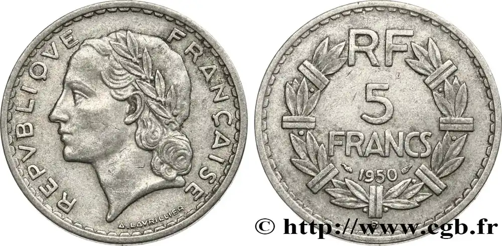 Type : 5 francs Lavrillier, aluminiumDate : 1948Nom de l’atelier/ville : Beaumont-Le-RogerQuantité frappée : 28.046.800Métal : aluminiumDiamètre : 31 mmAxe des coins : 6 h.Poids : 3,75 g.Tranche : lisseCommentaires sur l’état de conservation :Exemplaire astiquéRéférence ouvrage :Classement FRANC 2023 / FRANC 2023 classificationF.339/15AversTitulature avers : REPVBLIQVE FRANÇAISE.Description avers : tête laurée de la République aux cheveux longs à gauche ; au-dessous signé A. LAVRILLIER le long du listel.ReversTitulature revers : RF / 5 / FRANCS / (MILLÉSIME).Description revers : en quatre lignes dans le champ au-dessus du millésime encadré des différents, le tout dans une couronne de laurier ornée de sept bagues.CommentaireExemplaire avec le 9 ouvert.HistoriqueQUATRIÈME RÉPUBLIQUE(16/01/1947-8/01/1959) Se caractérisant par un régime parlementaire doublé d’une grande instabilité ministérielle, la Quatrième République a pour particularité de n’avoir jamais été officiellement proclamée. En effet, De Gaulle, lors de son arrivée à Paris le 25 août 1944, refuse de le faire sous prétexte que la République n’avait jamais cessé d’exister. Considérant que l’État français du maréchal Pétain n’était qu’un simple état de fait, il estime que la République a survécu dans la France libre et son acte de naissance doit alors être le 18 juin 1940. Toutefois, son départ, le 20 janvier 1946, et le référendum du 13 octobre 1946 approuvant une nouvelle Constitution, marquent le début officiel de cette république. Elle connaît deux présidents : Vincent Auriol (16/01/1947 – 23/12/1953) et René Coty (23/12/1953 – 8/1/1959). La crise ouverte causée par la révolte de l’armée d’Algérie entraîne, en 1958, sa chute qui est confirmée par l’adoption d’une nouvelle constitution le 28 septembre 1958. Néanmoins, elle ne cesse définitivement d’être que le 8 janvier 1959 lors de l’installation du général de Gaulle comme président de la Ve République.
