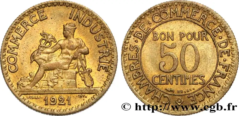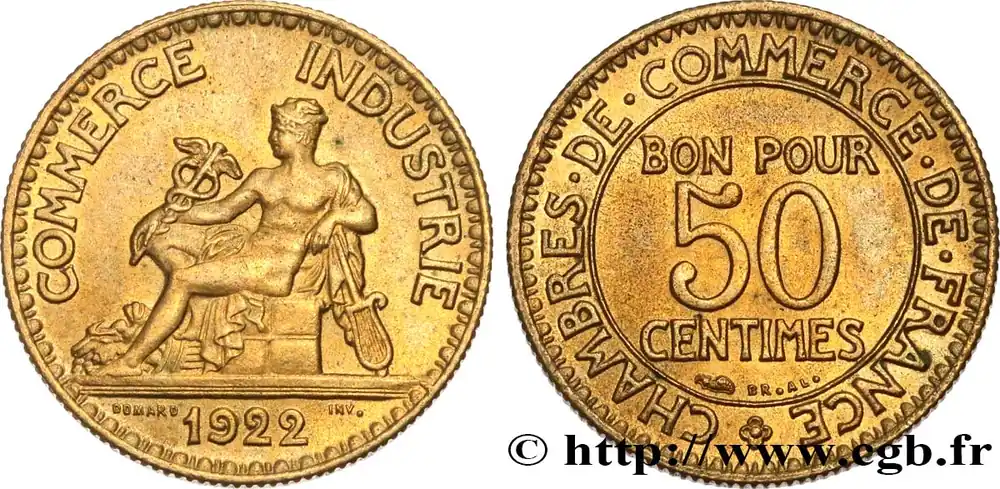 Type : 50 centimes Chambres de CommerceDate : 1922Nom de l’atelier/ville : ParisQuantité frappée : 86225994Métal : bronze-aluminiumDiamètre : 18 mmAxe des coins : 6 h.Poids : 2 g.Tranche : canneléeSlabGENI : MS65Commentaires sur l’état de conservation :Sous coque GENI MS65Référence ouvrage :Classement FRANC 2023 / FRANC 2023 classificationF.191/4AversTitulature avers : COMMERCE – INDUSTRIE.Description avers : Mercure assis à gauche, tenant un caducée ailé et appuyé sur un gouvernail ; une corne d’abondance à ses pieds ; sous un trait d’exergue 1922 et de part et d’autre DOMARD / INV..ReversTitulature revers : (ROSETTE) CHAMBRES. DE. COMMERCE. DE. FRANCE.Description revers : BON POUR / 50 / CENTIMES en trois lignes dans le champ, au-dessous Br. Al..HistoriqueTROISIÈME RÉPUBLIQUE(4/09/1870-10/07/1940) La nouvelle de la capitulation de Sedan provoque la révolution du 4 septembre 1870 à Paris. Proclamée à l’Hôtel de Ville, la République est dotée d’un gouvernement provisoire appelé gouvernement de la Défense nationale. Menacé à gauche par l’insurrection de la Commune et à droite par les monarchistes, le nouveau régime connaît des débuts difficiles. Chef du pouvoir exécutif dans un premier temps (février 1871), Thiers est chargé de réorganiser le pays avant de choisir sa forme de gouvernement. Il devient président de la République en août 1871 et, malgré son action de libération du territoire, doit quitter son poste en mars 1873 face à l’opposition royaliste. Il est alors remplacé par Mac-Mahon favorable au rétablissement de la monarchie mais celle-ci n’est pas restaurée à la suite de la question du drapeau. La loi du septennat est alors mise en place en novembre 1873 puis, en 1875, sont votées les lois fondamentales qui servent de Constitution à la Troisième République. Régime parlementaire, elle se caractérise notamment par la nette prépondérance du pouvoir législatif sur le pouvoir exécutif. Anticléricale, la Troisième République rend l’école gratuite, laïque et obligatoire mais continue la politique coloniale pour ses ambitions économiques, stratégiques et morales. La séparation des Églises et de l’État est votée en 1905. L’idée d’une revanche sur l’Allemagne et un nationalisme important sont au cœur de la crise boulangiste, du scandale de Panama ou de l’affaire Dreyfus des années 1886-1899 tandis que la politique étrangère est très active notamment au Maroc et que la course aux armements se développe. La Première Guerre mondiale coûte cher à la France qui ne se relève qu’à partir de 1920 voire 1928 pour la monnaie avec le franc « Poincaré ». La crise de 1929 ne se fait sentir qu’à partir de 1932 mais dure jusqu’en 1939, période durant laquelle l’instabilité ministérielle est très importante. Vacillant en 1934, la Troisième République trouve un nouveau ciment unitaire avec l’antifascisme qui permet l’arrivée au pouvoir du Front populaire en 1936. Mais, paralysée face à l’Allemagne, la France va alors s’enliser dans une « drôle de guerre » puis connaître l’une des plus grandes défaites de son histoire en juin 1940. Réunies en Assemblée nationale à Vichy le 10 juillet 1940, les Chambres, pourtant élues en 1936, votent les pleins pouvoirs à Pétain dans une sorte de suicide collectif par 569 voix pour, 80 voix contre et 18 abstentions.