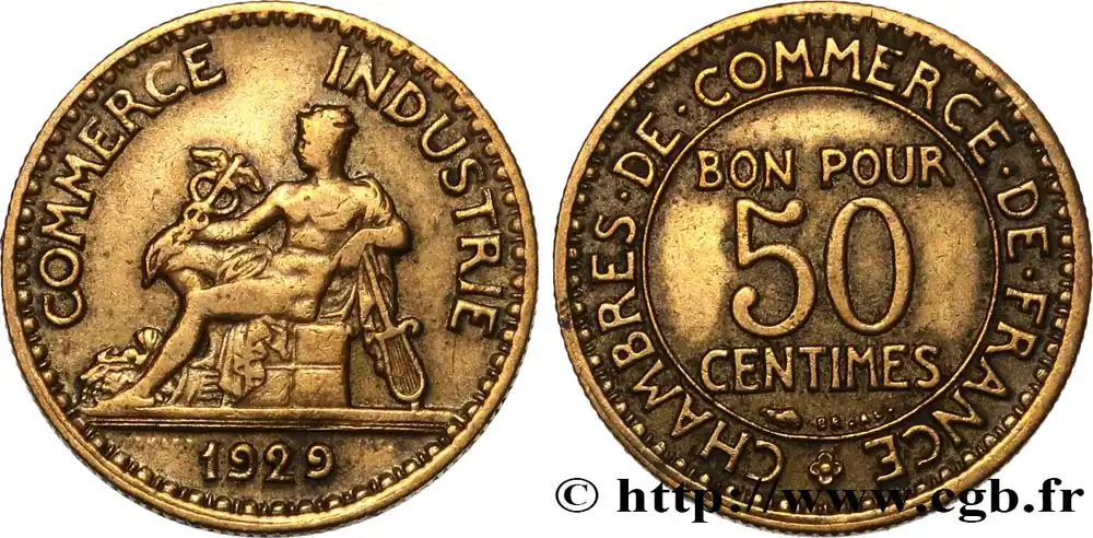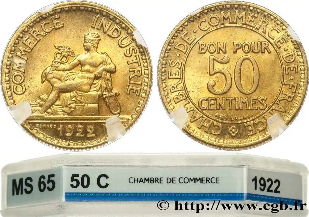 Type : 50 centimes Chambres de CommerceDate : 1923Nom de l’atelier/ville : ParisQuantité frappée : 119583707Métal : bronze-aluminiumDiamètre : 18 mmAxe des coins : 6 h.Poids : 2 g.Tranche : canneléeSlabPCGS : MS66Commentaires sur l’état de conservation :Sous coque PCGS MS66Référence ouvrage :Classement FRANC 2023 / FRANC 2023 classificationF.191/5AversTitulature avers : COMMERCE – INDUSTRIE.Description avers : Mercure assis à gauche, tenant un caducée ailé et appuyé sur un gouvernail ; une corne d’abondance à ses pieds ; sous un trait d’exergue 1923 et de part et d’autre DOMARD / INV..ReversTitulature revers : (ROSETTE) CHAMBRES. DE. COMMERCE. DE. FRANCE.Description revers : BON POUR / 50 / CENTIMES en trois lignes dans le champ, au-dessous Br. Al..HistoriqueTROISIÈME RÉPUBLIQUE(4/09/1870-10/07/1940) La nouvelle de la capitulation de Sedan provoque la révolution du 4 septembre 1870 à Paris. Proclamée à l’Hôtel de Ville, la République est dotée d’un gouvernement provisoire appelé gouvernement de la Défense nationale. Menacé à gauche par l’insurrection de la Commune et à droite par les monarchistes, le nouveau régime connaît des débuts difficiles. Chef du pouvoir exécutif dans un premier temps (février 1871), Thiers est chargé de réorganiser le pays avant de choisir sa forme de gouvernement. Il devient président de la République en août 1871 et, malgré son action de libération du territoire, doit quitter son poste en mars 1873 face à l’opposition royaliste. Il est alors remplacé par Mac-Mahon favorable au rétablissement de la monarchie mais celle-ci n’est pas restaurée à la suite de la question du drapeau. La loi du septennat est alors mise en place en novembre 1873 puis, en 1875, sont votées les lois fondamentales qui servent de Constitution à la Troisième République. Régime parlementaire, elle se caractérise notamment par la nette prépondérance du pouvoir législatif sur le pouvoir exécutif. Anticléricale, la Troisième République rend l’école gratuite, laïque et obligatoire mais continue la politique coloniale pour ses ambitions économiques, stratégiques et morales. La séparation des Églises et de l’État est votée en 1905. L’idée d’une revanche sur l’Allemagne et un nationalisme important sont au cœur de la crise boulangiste, du scandale de Panama ou de l’affaire Dreyfus des années 1886-1899 tandis que la politique étrangère est très active notamment au Maroc et que la course aux armements se développe. La Première Guerre mondiale coûte cher à la France qui ne se relève qu’à partir de 1920 voire 1928 pour la monnaie avec le franc « Poincaré ». La crise de 1929 ne se fait sentir qu’à partir de 1932 mais dure jusqu’en 1939, période durant laquelle l’instabilité ministérielle est très importante. Vacillant en 1934, la Troisième République trouve un nouveau ciment unitaire avec l’antifascisme qui permet l’arrivée au pouvoir du Front populaire en 1936. Mais, paralysée face à l’Allemagne, la France va alors s’enliser dans une « drôle de guerre » puis connaître l’une des plus grandes défaites de son histoire en juin 1940. Réunies en Assemblée nationale à Vichy le 10 juillet 1940, les Chambres, pourtant élues en 1936, votent les pleins pouvoirs à Pétain dans une sorte de suicide collectif par 569 voix pour, 80 voix contre et 18 abstentions.