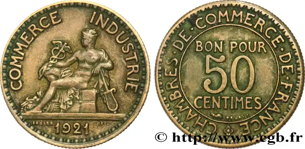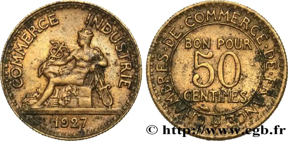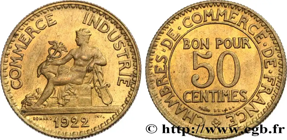 Type : 50 centimes Chambres de CommerceDate : 1927Nom de l’atelier/ville : ParisQuantité frappée : 23702858Métal : bronze-aluminiumDiamètre : 18 mmAxe des coins : 6 h.Poids : 2,04 g.Tranche : canneléeCommentaires sur l’état de conservation :Traces de nettoyageRéférence ouvrage :Classement FRANC 2023 / FRANC 2023 classificationF.191/9AversTitulature avers : COMMERCE – INDUSTRIE.Description avers : Mercure assis à gauche, tenant un caducée ailé et appuyé sur un gouvernail ; une corne d’abondance à ses pieds ; sous un trait d’exergue 1927 et de part et d’autre DOMARD / INV..ReversTitulature revers : (ROSETTE) CHAMBRES. DE. COMMERCE. DE. FRANCE.Description revers : BON POUR / 50 / CENTIMES en trois lignes dans le champ, au-dessous Br. Al..HistoriqueTROISIÈME RÉPUBLIQUE(4/09/1870-10/07/1940) La nouvelle de la capitulation de Sedan provoque la révolution du 4 septembre 1870 à Paris. Proclamée à l’Hôtel de Ville, la République est dotée d’un gouvernement provisoire appelé gouvernement de la Défense nationale. Menacé à gauche par l’insurrection de la Commune et à droite par les monarchistes, le nouveau régime connaît des débuts difficiles. Chef du pouvoir exécutif dans un premier temps (février 1871), Thiers est chargé de réorganiser le pays avant de choisir sa forme de gouvernement. Il devient président de la République en août 1871 et, malgré son action de libération du territoire, doit quitter son poste en mars 1873 face à l’opposition royaliste. Il est alors remplacé par Mac-Mahon favorable au rétablissement de la monarchie mais celle-ci n’est pas restaurée à la suite de la question du drapeau. La loi du septennat est alors mise en place en novembre 1873 puis, en 1875, sont votées les lois fondamentales qui servent de Constitution à la Troisième République. Régime parlementaire, elle se caractérise notamment par la nette prépondérance du pouvoir législatif sur le pouvoir exécutif. Anticléricale, la Troisième République rend l’école gratuite, laïque et obligatoire mais continue la politique coloniale pour ses ambitions économiques, stratégiques et morales. La séparation des Églises et de l’État est votée en 1905. L’idée d’une revanche sur l’Allemagne et un nationalisme important sont au cœur de la crise boulangiste, du scandale de Panama ou de l’affaire Dreyfus des années 1886-1899 tandis que la politique étrangère est très active notamment au Maroc et que la course aux armements se développe. La Première Guerre mondiale coûte cher à la France qui ne se relève qu’à partir de 1920 voire 1928 pour la monnaie avec le franc « Poincaré ». La crise de 1929 ne se fait sentir qu’à partir de 1932 mais dure jusqu’en 1939, période durant laquelle l’instabilité ministérielle est très importante. Vacillant en 1934, la Troisième République trouve un nouveau ciment unitaire avec l’antifascisme qui permet l’arrivée au pouvoir du Front populaire en 1936. Mais, paralysée face à l’Allemagne, la France va alors s’enliser dans une « drôle de guerre » puis connaître l’une des plus grandes défaites de son histoire en juin 1940. Réunies en Assemblée nationale à Vichy le 10 juillet 1940, les Chambres, pourtant élues en 1936, votent les pleins pouvoirs à Pétain dans une sorte de suicide collectif par 569 voix pour, 80 voix contre et 18 abstentions.