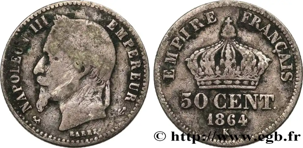 Type : 50 centimes Napoléon III, tête lauréeDate : 1865Nom de l’atelier/ville : ParisQuantité frappée : 7.397.612Métal : argentTitre en millième : 835 ‰Diamètre : 18 mmAxe des coins : 6 h.Poids : 2,49 g.Tranche : canneléeCommentaires sur l’état de conservation :Traces de nettoyageRéférence ouvrage :Classement FRANC 2023 / FRANC 2023 classificationF.188/5AversTitulature avers : (DIFFÉRENT) NAPOLEON III EMPEREUR (DIFFÉRENT).Description avers : tête laurée de Napoléon III à gauche, un ruban descendant sur l’épaule ; au-dessous BARRE.ReversTitulature revers : EMPIRE FRANÇAIS.Description revers : 50 CENT. au-dessus du millésime et de la lettre d’atelier, sous une couronne impériale d’aigles supportant un globe crucigère.HistoriqueSECOND EMPIRE(02/12/1852-04/09/1870) Proclamé empereur sous le nom de Napoléon III, Louis Napoléon fait son entrée solennelle à Paris le 2 décembre 1852. Il épouse Eugénie Marie de Montijo, aristocrate espagnole, en janvier 1853. Son règne peut se diviser en trois périodes : l’Empire autoritaire jusqu’en 1860 ; l’Empire libéral de 1860 à 1870 puis l’Empire parlementaire en 1870. Durant l’Empire autoritaire, Napoléon III exerce son pouvoir sans partage, contrôle la presse tandis que les journaux pratiquent l’autocensure pour éviter leur suppression. Les préfets exercent une puissance illimitée dans les départements, les maires, les fonctionnaires sont nommés par le gouvernement. Comme sous le Premier Empire, l’Éducation et l’Université sont surveillées. Maintenant les grands principes de la révolution, la souveraineté du peuple est continuée grâce à la consultation par plébiscite. Sur le plan économique, l’essor est important, l’industrialisation se développe ainsi que les organismes de crédit et les grands magasins. Le prestige militaire est accru par la guerre de Crimée qui permet à la France de jouer un rôle international. L’attentat d’Orsini (janvier 1858) n’empêche nullement la France d’intervenir en Italie pour faire triompher le principe des nationalités et permet le rattachement de Nice et de la Savoie par le traité de Turin (mars 1860). Dès 1860, l’Empire évolue vers plus de libertés : traité libre-échangiste de commerce avec l’Angleterre, apparition d’une faible opposition dans le Corps législatif, octroi du droit de grève (1864), libéralisation de la presse (1868). Sur le plan international, la France acquiert la Nouvelle-Calédonie, la Cochinchine et encourage le creusement du canal de Suez par Ferdinand de Lesseps. Au Mexique, le soutien à Maximilien et à l’Autriche est toutefois un échec. Les élections de 1869 sont très mauvaises pour le régime et l’opposition obtient 45 % des voix. Le régime évolue alors vers un Empire parlementaire en appelant Émile Ollivier, chef du parti orléaniste et libéral, au pouvoir. Après Sadowa en 1866 où la Prusse écrase l’Autriche, l’affaire du trône d’Espagne et de la dépêche d’Ems entraînent la guerre qui est déclarée le 19 juillet 1870. Accumulant les revers, l’armée française est encerclée dans Metz puis Napoléon III, malade, capitule à Sedan le 2 septembre. Aussitôt la nouvelle connue, la déchéance de l’Empire est annoncée par Gambetta puis la République est proclamée le 4 septembre. Napoléon III est alors emmené en captivité en Hesse puis part dans le Kent où il meurt en 1873.
