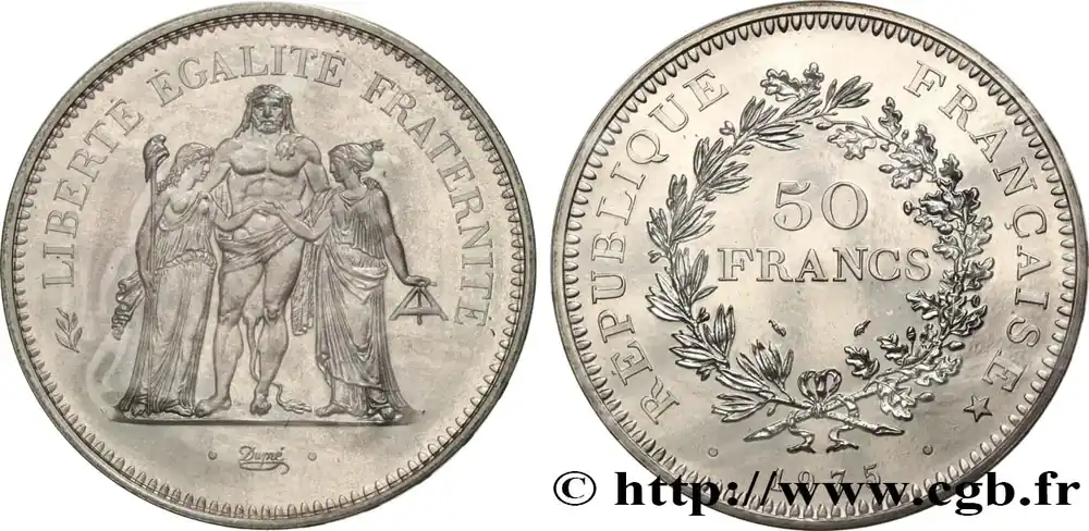 Type : 50 francs HerculeDate : 1980Quantité frappée : 60.000Métal : argentTitre en millième : 900 ‰Diamètre : 41 mmAxe des coins : 6 h.Poids : 30 g.Tranche : Motifs en relief se rapportant respectivement à l’agriculture (gerbe de blé, coq, grappe de raisin), à l’industrie (marteau, roue dentée, compas) et au commerce (balance, corne d’abondance, caducée). Référence ouvrage :Classement FRANC 2023 / FRANC 2023 classificationF.427/8AversTitulature avers : (RAMEAU D’OLIVIER) LIBERTÉ ÉGALITÉ FRATERNITÉ.Description avers : Hercule barbu demi-nu, debout de face avec la léonté, sur son épaule gauche une patte du lion, sur son bras et autour de sa taille la peau du lion de Némée, derrière ses jambes queue et pattes du lion, unissant la Liberté debout à gauche tournée à droite tenant une pique surmontée d’un bonnet phrygien, vêtue d’un peplos, et l’Égalité debout à droite tournée à gauche, tenant le niveau, vêtue d’un chiton ; à l’exergue Dupré signé en cursif entre deux points, légende serrée, débutant au niveau du drapé de la Liberté.ReversTitulature revers : RÉPUBLIQUE FRANÇAISE *.Description revers : 50 / FRANCS en deux lignes, différents au-dessous, le tout contenu dans une couronne composée à gauche d’une branche d’olivier, à droite d’une branche de chêne avec une grande feuille finale (deux glands intérieurs sur le haut de la branche de droite, un gland à l’extérieur sur le bas de cette branche), nouées à leur base par un ruban ; au-dessous deux points encadrant le millésime.CommentaireExemplaire sous plastique provenant d’une série Fleurs De Coins.HistoriqueCINQUIÈME RÉPUBLIQUE(depuis le 08/01/1959) La Cinquième République, dont la constitution a été approuvée par référendum le 28 septembre 1958 par plus de 79 % des Français, ne débute officiellement qu’avec l’installation du général de Gaulle comme président le 8 janvier 1959. La constitution est modifiée le 28 octobre 1962 par référendum où une majorité de 62 % des voix approuve l’élection du président de la République au suffrage universel direct. Les différents présidents de la Ve République sont Charles de Gaulle (8/01/1959 – 27/04/1969, retrait et Alain Poher devient président par intérim), Georges Pompidou (15/06/1969 – 2/04/1974, décédé, Alain Poher devient président par intérim), Valéry Giscard d’Estaing (19/05/1974 – 21/05/1981), François Mitterrand (21/05/1981 – 7/05/1995), Jacques Chirac (7/05/1995 – 16/05/2007) , Nicolas Sarkozy (16/05/2007 – 15/05/2012), François Hollande (15/05/2012 – 14/05/2017) et Emmanuel Macron (14/05/2017 – ).