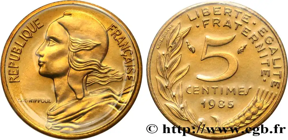 Type : 5 centimes MarianneDate : 1983Nom de l’atelier/ville : PessacQuantité frappée : 132000972Métal : bronze-aluminiumDiamètre : 17 mmAxe des coins : 6 h.Poids : 2 g.Tranche : lisseRéférence ouvrage :Classement FRANC 2023 / FRANC 2023 classificationF.125/19AversTitulature avers : REPUBLIQUE FRANÇAISE.Description avers : Buste habillé de la République aux cheveux longs à gauche, les cheveux et les rubans du col au vent, coiffée d’un bonnet phrygien ; dans le champ, devant le cou dans le champ gauche LAGRIFFOUL.ReversTitulature revers : LIBERTE – EGALITE / – FRATERNITE -.Description revers : 5 / CENTIMES en deux lignes dans le champ, encadré des différents, au-dessus de 1983, le tout contenu dans une branche de laurier et un épi de blé ; à gauche de la branche de laurier, contre le listel, A. DIEUDONNE..CommentaireExemplaire sous plastique issu d’une série Fleurs De Coins.HistoriqueCINQUIÈME RÉPUBLIQUE(depuis le 08/01/1959) La Cinquième République, dont la constitution a été approuvée par référendum le 28 septembre 1958 par plus de 79 % des Français, ne débute officiellement qu’avec l’installation du général de Gaulle comme président le 8 janvier 1959. La constitution est modifiée le 28 octobre 1962 par référendum où une majorité de 62 % des voix approuve l’élection du président de la République au suffrage universel direct. Les différents présidents de la Ve République sont Charles de Gaulle (8/01/1959 – 27/04/1969, retrait et Alain Poher devient président par intérim), Georges Pompidou (15/06/1969 – 2/04/1974, décédé, Alain Poher devient président par intérim), Valéry Giscard d’Estaing (19/05/1974 – 21/05/1981), François Mitterrand (21/05/1981 – 7/05/1995), Jacques Chirac (7/05/1995 – 16/05/2007) , Nicolas Sarkozy (16/05/2007 – 15/05/2012), François Hollande (15/05/2012 – 14/05/2017) et Emmanuel Macron (14/05/2017 – ).