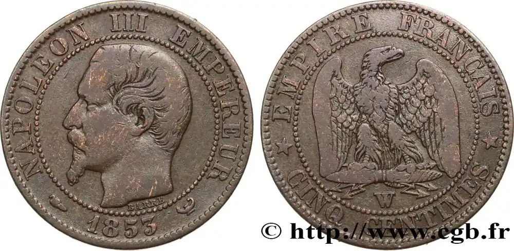 Type : Cinq centimes Napoléon III, tête nueDate : 1855Nom de l’atelier/ville : StrasbourgQuantité frappée : 5996710Métal : bronzeDiamètre : 25 mmAxe des coins : 6 h.Poids : 4,96 g.Tranche : lisseRéférence ouvrage :Classement FRANC 2023 / FRANC 2023 classificationF.116/20AversTitulature avers : (LEVRETTE) NAPOLEON III EMPEREUR (MM)// 1855.Description avers : Tête nue de Napoléon III à gauche ; signé BARRE au-dessous.ReversTitulature revers : EMPIRE FRANÇAIS// * CINQ CENTIMES *.Description revers : Aigle debout de face sur un foudre, les ailes ouvertes, la tête tournée à droite ; au-dessous, BB.CommentaireExemplaire avec le différent levrette.HistoriqueSECOND EMPIRE(02/12/1852-04/09/1870) Proclamé empereur sous le nom de Napoléon III, Louis Napoléon fait son entrée solennelle à Paris le 2 décembre 1852. Il épouse Eugénie Marie de Montijo, aristocrate espagnole, en janvier 1853. Son règne peut se diviser en trois périodes : l’Empire autoritaire jusqu’en 1860 ; l’Empire libéral de 1860 à 1870 puis l’Empire parlementaire en 1870. Durant l’Empire autoritaire, Napoléon III exerce son pouvoir sans partage, contrôle la presse tandis que les journaux pratiquent l’autocensure pour éviter leur suppression. Les préfets exercent une puissance illimitée dans les départements, les maires, les fonctionnaires sont nommés par le gouvernement. Comme sous le Premier Empire, l’Éducation et l’Université sont surveillées. Maintenant les grands principes de la révolution, la souveraineté du peuple est continuée grâce à la consultation par plébiscite. Sur le plan économique, l’essor est important, l’industrialisation se développe ainsi que les organismes de crédit et les grands magasins. Le prestige militaire est accru par la guerre de Crimée qui permet à la France de jouer un rôle international. L’attentat d’Orsini (janvier 1858) n’empêche nullement la France d’intervenir en Italie pour faire triompher le principe des nationalités et permet le rattachement de Nice et de la Savoie par le traité de Turin (mars 1860). Dès 1860, l’Empire évolue vers plus de libertés : traité libre-échangiste de commerce avec l’Angleterre, apparition d’une faible opposition dans le Corps législatif, octroi du droit de grève (1864), libéralisation de la presse (1868). Sur le plan international, la France acquiert la Nouvelle-Calédonie, la Cochinchine et encourage le creusement du canal de Suez par Ferdinand de Lesseps. Au Mexique, le soutien à Maximilien et à l’Autriche est toutefois un échec. Les élections de 1869 sont très mauvaises pour le régime et l’opposition obtient 45 % des voix. Le régime évolue alors vers un Empire parlementaire en appelant Émile Ollivier, chef du parti orléaniste et libéral, au pouvoir. Après Sadowa en 1866 où la Prusse écrase l’Autriche, l’affaire du trône d’Espagne et de la dépêche d’Ems entraînent la guerre qui est déclarée le 19 juillet 1870. Accumulant les revers, l’armée française est encerclée dans Metz puis Napoléon III, malade, capitule à Sedan le 2 septembre. Aussitôt la nouvelle connue, la déchéance de l’Empire est annoncée par Gambetta puis la République est proclamée le 4 septembre. Napoléon III est alors emmené en captivité en Hesse puis part dans le Kent où il meurt en 1873.
