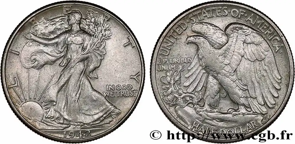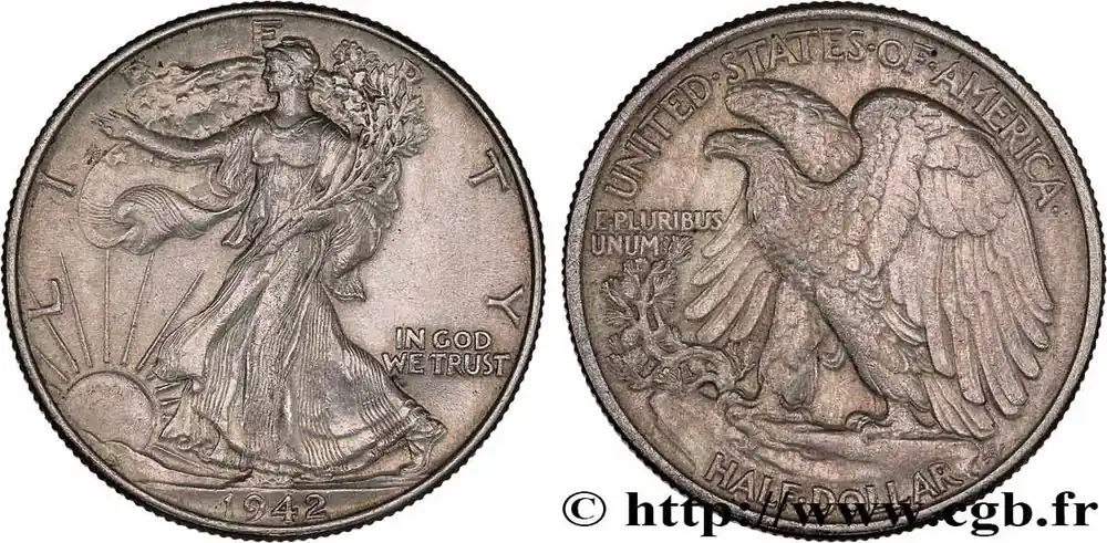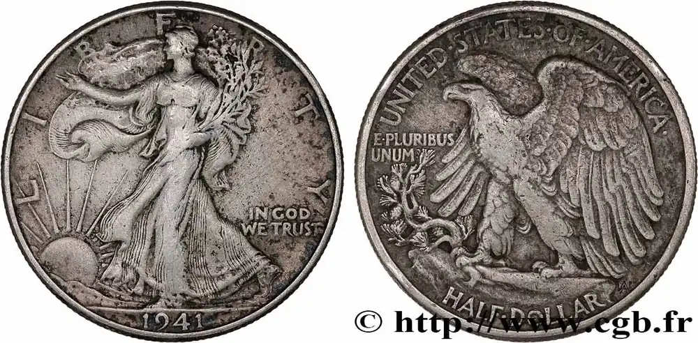 Type : 1/2 Dollar Walking LibertyDate : 1947Nom de l’atelier/ville : DenverQuantité frappée : 3900600Métal : argentTitre en millième : 900 ‰Diamètre : 30,6 mmAxe des coins : 6 h.Poids : 12,25 g.Tranche : canneléeCommentaires sur l’état de conservation :la monnaie présente des traces de nettoyage et des coups sur la trancheRéférence ouvrage :KM20/142 – Y.- AversTitulature avers : LIBERTY // (DATE).Description avers : Liberté marchant à gauche, soleil levant ; IN GOD / WE TRUST dans le champ.Traduction avers : (Liberté).ReversTitulature revers : UNITED STATES OF AMERICA // HALF DOLLAR.Description revers : aigle aux ailes déployées ; E.PLURIBUS / UNUM dans le champ à gauche.Traduction revers : (États-Unis d’Amérique // demi-dollar).HistoriqueÉTATS-UNIS D’AMÉRIQUE
