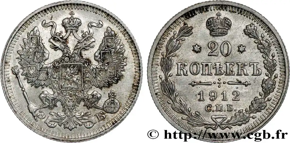 Type : 20 Kopecks aigle bicéphaleDate : 1913Nom de l’atelier/ville : Saint-PetersbourgQuantité frappée : 4250000Métal : argentTitre en millième : 500 ‰Diamètre : 22 mmAxe des coins : 12 h.Poids : 3,65 g.Tranche : canneléeRéférence ouvrage :KM20/22a.1 AversTitulature avers : BC.Description avers : Aigle bicéphale héraldique couronné.ReversTitulature revers : (LÉGENDE CYRILLIQUE) * 20 * / КОПѢЕКЪ / 1913 / С.П.Б..Description revers : Légende dans une couronne ouverte.Traduction revers : (20 Kopecks).HistoriqueRUSSIE