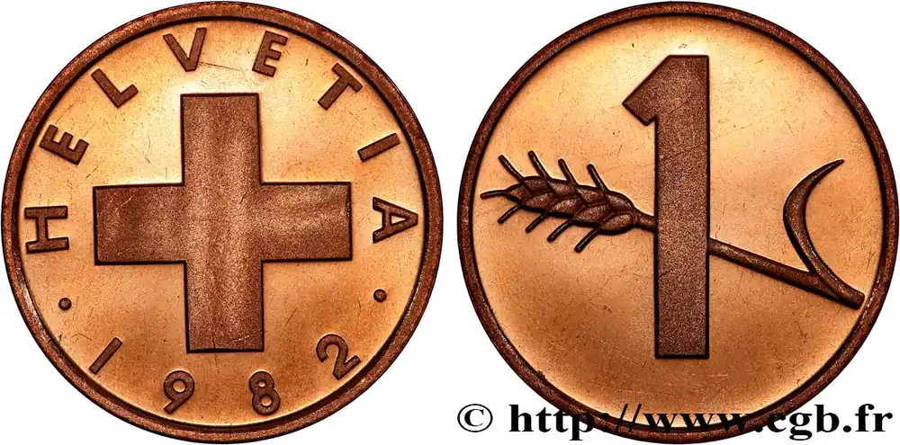 Type : 1 Centime Croix Suisse / épi d’avoineDate : 1982Nom de l’atelier/ville : BerneQuantité frappée : 6665000Métal : zincDiamètre : 16 mmAxe des coins : 12 h.Poids : 1,50 g.Tranche : lisseRéférence ouvrage :KM20/46 AversTitulature avers : HELVETIA // . 1982 ..Description avers : croix.ReversTitulature revers : 1.Description revers : épi.HistoriqueSUISSE