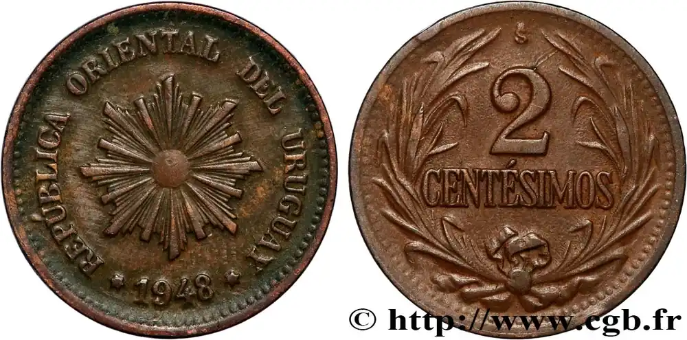 Type : 2 Centesimos soleilDate : 1946Nom de l’atelier/ville : SantiagoQuantité frappée : 2500000Métal : cupro-nickelDiamètre : 20 mmAxe des coins : 6 h.Poids : 3,43 g.Tranche : lisseRéférence ouvrage :KM20/20a AversTitulature avers : REPÚBLICA ORIENTAL DEL URUGUAY // 1946.Description avers : Soleil radiant.ReversTitulature revers : SO / 2 / CENTÉSIMO.Description revers : Dans le champ entre deux palmes.HistoriqueURUGUAY