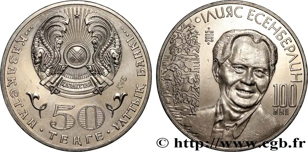 Type : 50 Tenge 100e anniversaire de la naissance de Ilyas EsenberlinDate : 2015Nom de l’atelier/ville : Oust–KamenogorskQuantité frappée : 100000Métal : cupro-nickelDiamètre : 31 mmAxe des coins : 12 h.Poids : 11,17 g.Tranche : séries de canneluresRéférence ouvrage :KM21/320 AversTitulature avers : ҚАЗАҚСТАН ҰЛТТЫҚ БАНКІ // NATIONAL BANK OF KAZAKHSTAN // 50 / ТЕҢГЕ.Description avers : terre dans une main.Traduction avers : (Banque Nationale du Kazakhstan – 50 Tenge).ReversTitulature revers : ІЛИЯС ЕСЕНБЕРЛИН // 2015 // 100 / ЖЫЛ.Description revers : buste de face de Ilyas Esenberlin.Traduction revers : (Ilyas Esenberlin // 2015 // 100 / ans).CommentaireIlyas Esenberlin (1915-1983) était un poète, écrivain et personnalité publique kazakh.HistoriqueKAZAKHSTAN