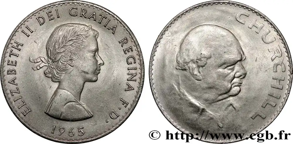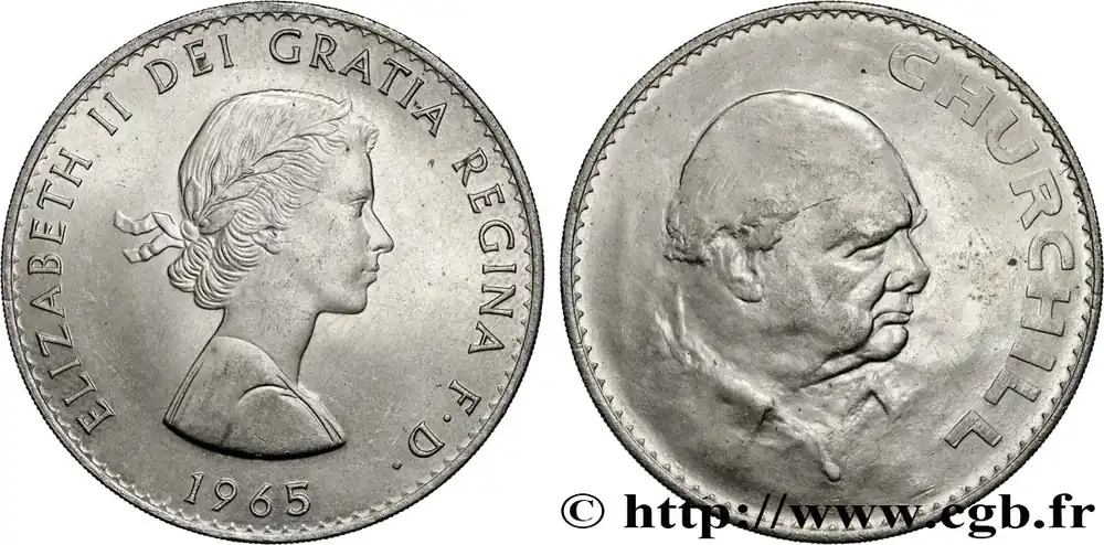 Type : 1 Crown Winston ChurchillDate : 1965Quantité frappée : 9640000Métal : cupro-nickelDiamètre : 38,61 mmAxe des coins : 12 h.Poids : 28,43 g.Tranche : striéeRéférence ouvrage :KM20/910 AversTitulature avers : ELIZABETH II DEI GRATIA REGINA D. F. / 1965.Description avers : Buste à droite lauré de la reine Élisabeth II.ReversTitulature revers : CHURCHILL.Description revers : portrait de trois quart à droite de Winston Churchill.HistoriqueROYAUME-UNI