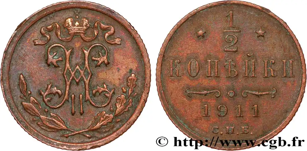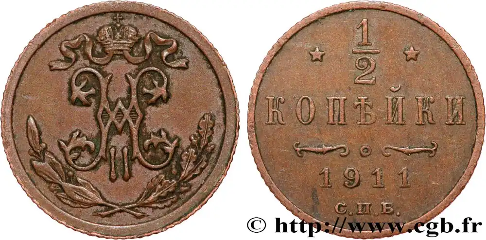 Type : 1/2 Kopeck monogramme Nicolas IIDate : 1911Nom de l’atelier/ville : Saint-PetersbourgQuantité frappée : 35800000Métal : cuivreDiamètre : 16 mmAxe des coins : 12 h.Poids : 1,63 g.Tranche : striéeRéférence ouvrage :KM20/48.1 AversDescription avers : monogramme couronné du tsar Nicolas II, rameaux.ReversTitulature revers : (LÉGENDE EN CYRILLIQUE) * 1/2 * / КОПѢЙКИ / 1911 / С. П.Б..Description revers : dans le champ.Traduction revers : (1/2 Kopeck) 1911.HistoriqueRUSSIE
