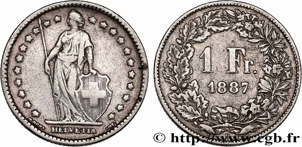 Type : 1 Franc HelvetiaDate : 1943Nom de l’atelier/ville : BerneQuantité frappée : 3526000Métal : argentTitre en millième : 835 ‰Diamètre : 23 mmAxe des coins : 6 h.Poids : 4,97 g.Tranche : canneléeRéférence ouvrage :KM20/24 AversTitulature avers : HELVETIA.Description avers : Helvetia debout tenant une lance et un bouclier à la croix posé à ses pieds, dans une couronne d’étoile.ReversTitulature revers : 1 FR. ET (DATE).Description revers : dans une couronne composite, de feuilles de chênes à gauche et de fleurs variées à droite.HistoriqueSUISSE