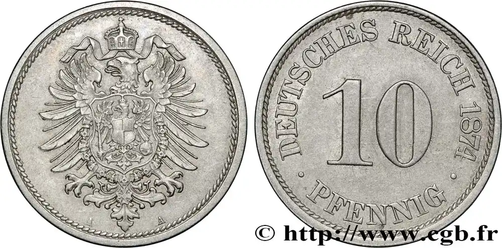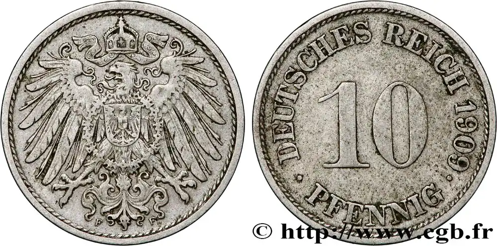 Type : 10 Pfennig aigle héraldiqueDate : 1907Nom de l’atelier/ville : BerlinQuantité frappée : 17970747Métal : cupro-nickelDiamètre : 21 mmAxe des coins : 12 h.Poids : 3,95 g.Tranche : lisseRéférence ouvrage :AKS.12 – KM20/12 AversTitulature avers : A – A.Description avers : Aigle couronné aux ailes déployées.ReversTitulature revers : DEUTSCHES REICH 1907 // 10 / • PFENNIG •.Description revers : Dans le champ.HistoriqueALLEMAGNE