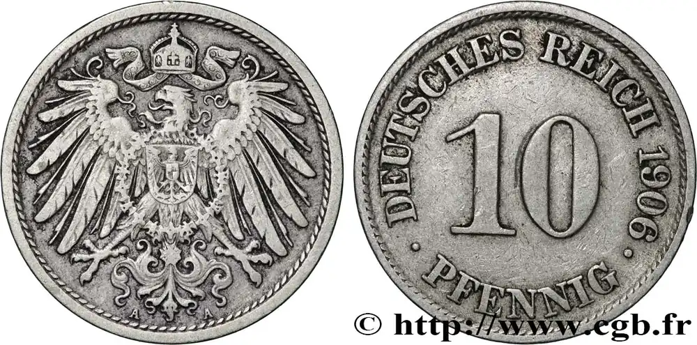 Type : 10 Pfennig aigle héraldiqueDate : 1907Nom de l’atelier/ville : BerlinQuantité frappée : 17970747Métal : cupro-nickelDiamètre : 21 mmAxe des coins : 12 h.Poids : 3,95 g.Tranche : lisseRéférence ouvrage :AKS.12  – KM20/12 AversTitulature avers : A – A.Description avers : Aigle couronné aux ailes déployées.ReversTitulature revers : DEUTSCHES REICH 1907 // 10 / • PFENNIG •.Description revers : Dans le champ.HistoriqueALLEMAGNE