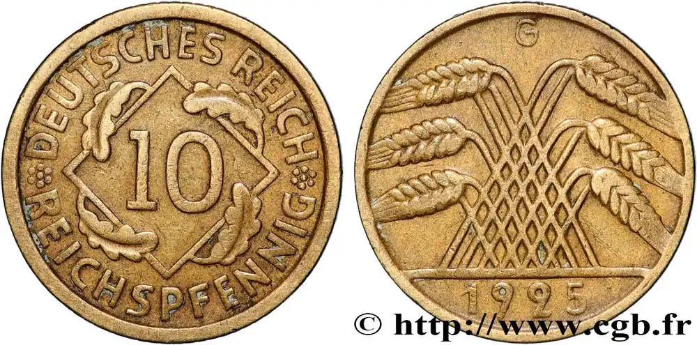 Type : 10 Reichspfennig gerbe de bléDate : 1929Nom de l’atelier/ville : Karlsruhe – GQuantité frappée : 5531806Métal : cuivreDiamètre : 21 mmAxe des coins : 12 h.Poids : 3,92 g.Tranche : lisseRéférence ouvrage :AKS.45 – KM20/40 AversTitulature avers : *DEUTSCHES REICH*REICHSPFENNIG.Description avers : chiffre dix dans un losange entouré de quatre feuilles de chêne.ReversTitulature revers : G // 1929.Description revers : épis de blé croisés.HistoriqueALLEMAGNE