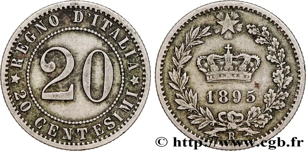 Type : 20 CentesimiDate : 1894Nom de l’atelier/ville : RomeQuantité frappée : 13901000Métal : nickelDiamètre : 21 mmAxe des coins : 6 h.Poids : 3,98 g.Tranche : striéeRéférence ouvrage :Mont.57  – KM.19/28.2 AversTitulature avers : REGNO D’ITALIA / *20 CENTESIMI*.Description avers : nombre “20” dans le champ.ReversTitulature revers : 1894.Description revers : couronne surmontée d’une étoile entre une couronne composée d’un rameau de chêne et d’un rameau d’olivier.HistoriqueITALIE