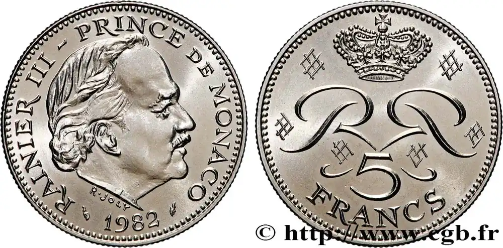 Type : 5 Francs Rainier IIIDate : 1971Nom de l’atelier/ville : ParisQuantité frappée : 250000Métal : cupro-nickelDiamètre : 29 mmAxe des coins : 6 h.Poids : 9,94 g.Tranche : striéeRéférence ouvrage :G.2019.153 – KM20/150 AversTitulature avers : RAINIER III PRINCE DE MONACO / 1971.Description avers : Tête de Rainier III à droite.ReversTitulature revers : 5 / FRANCS.Description revers : Deux R entrelacés et opposés sour une couronne princière.HistoriqueMONACO