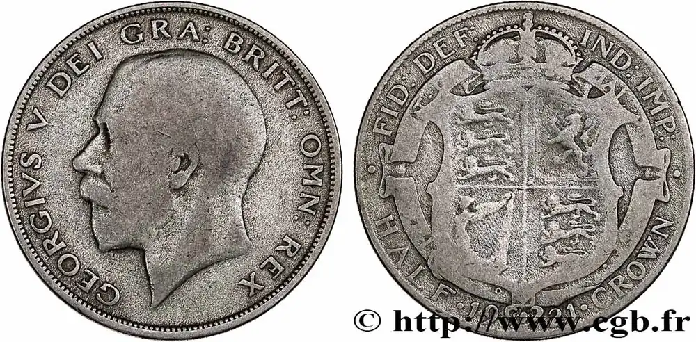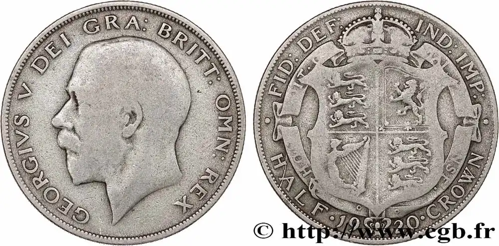 Type : 1/2 Crown Georges VDate : 1915Nom de l’atelier/ville : LondresQuantité frappée : 32433000Métal : argentTitre en millième : 925 ‰Diamètre : 32,3 mmAxe des coins : 12 h.Poids : 14,12 g.Tranche : striéeRéférence ouvrage :Sp.4011  – KM20/818.1 AversTitulature avers : GEORGIVS V DEI GRA: BRITT: OMN: REX.Description avers : portrait à gauche du roi Georges V.ReversTitulature revers : FID: DEF: IND: IMP: / . HALF . (DATE) . CROWN.Description revers : écu couronné du Royaume-Uni, motto HON. SOIT. QVI MAL . Y PENSE..CommentaireLa demi-couronne (1/2 Crown) vaut 2 Shillings et 6 Pence ou un huitième de Livre or. Ce type monétaire a été introduit en 1549 sous le règne d’Edouard VI..HistoriqueROYAUME-UNI