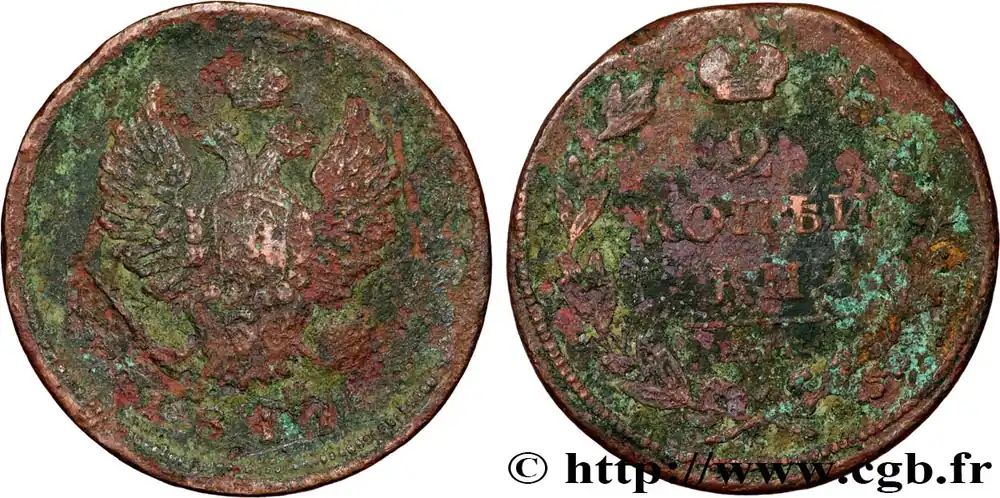 Type : 2 Kopecks aigle bicéphaleDate : 1811Nom de l’atelier/ville : Saint-PetersbourgMétal : cuivreDiamètre : 29 mmAxe des coins : 12 h.Poids : 12,98 g.Tranche : lisseRéférence ouvrage :KM.19/118.3 AversTitulature avers : 1811.Description avers : Aigle bicéphale couronné.ReversTitulature revers : (LÉGENDE EN CYRILLIQUE).Description revers : couronne et rameaux.CommentaireNicolas Ier (7/07/1796-2/03/1855), second fils de Paul Ier, est le frère d’Alexandre Ier et du grand-duc Constantin. À la mort de son frère Alexandre Ier, le 1er décembre 1825, et après le renoncement de son frère Constantin, il devient tsar de toutes les Russies et commence par réprimer le mouvement libéral des Décembristes puis le soulèvement de Pologne en 1831. Après avoir favorisé la libération de la Grèce, il se pose comme un défenseur des Slaves et s’oppose aux Turcs. Il trouve sur sa route les Anglais et les Français. Il meurt avant la défaite de la guerre de Crimée.HistoriqueRUSSIE