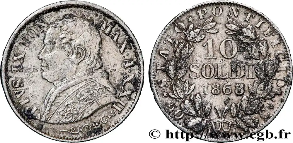 Type : 10 Soldi (50 Centesimi) Pie IX an XXIIDate : 1868Nom de l’atelier/ville : RomeQuantité frappée : 3950000Métal : argentTitre en millième : 900 ‰Diamètre : 18,5 mmAxe des coins : 6 h.Poids : 2,36 g.Tranche : canneléeRéférence ouvrage :Mont.390 – KM19/1386.1 AversTitulature avers : PIVS. IX. P. – M.A.XXII.Description avers : Buste du Saint-Père, Pie IX à gauche.ReversTitulature revers : * STATO * PONTIFICIO * / 50 – R – CMI.Description revers : Légende circulaire, au centre dans une couronne composite : 10/ SOLDI/ 1868.Traduction revers : (État Pontifical).HistoriqueVATICAN ET ÉTATS PONTIFICAUX