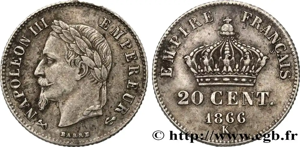 Type : 20 centimes Napoléon III, tête laurée, petit moduleDate : 1866Nom de l’atelier/ville : BordeauxQuantité frappée : 412858Métal : argentTitre en millième : 835 ‰Diamètre : 15 mmAxe des coins : 6 h.Poids : 0,98 g.Tranche : canneléeCommentaires sur l’état de conservation :Exemplaire nettoyéRéférence ouvrage :Classement FRANC 2023 / FRANC 2023 classificationF.149/6AversTitulature avers : NAPOLEON III – EMPEREUR.Description avers : Tête laurée de Napoléon III à gauche ; signé BARRE au-dessous.ReversTitulature revers : EMPIRE FRANCAIS// 20 CENT.// 1866 K.Description revers : Couronne impériale.HistoriqueSECOND EMPIRE(02/12/1852-04/09/1870) Proclamé empereur sous le nom de Napoléon III, Louis Napoléon fait son entrée solennelle à Paris le 2 décembre 1852. Il épouse Eugénie Marie de Montijo, aristocrate espagnole, en janvier 1853. Son règne peut se diviser en trois périodes : l’Empire autoritaire jusqu’en 1860 ; l’Empire libéral de 1860 à 1870 puis l’Empire parlementaire en 1870. Durant l’Empire autoritaire, Napoléon III exerce son pouvoir sans partage, contrôle la presse tandis que les journaux pratiquent l’autocensure pour éviter leur suppression. Les préfets exercent une puissance illimitée dans les départements, les maires, les fonctionnaires sont nommés par le gouvernement. Comme sous le Premier Empire, l’Éducation et l’Université sont surveillées. Maintenant les grands principes de la révolution, la souveraineté du peuple est continuée grâce à la consultation par plébiscite. Sur le plan économique, l’essor est important, l’industrialisation se développe ainsi que les organismes de crédit et les grands magasins. Le prestige militaire est accru par la guerre de Crimée qui permet à la France de jouer un rôle international. L’attentat d’Orsini (janvier 1858) n’empêche nullement la France d’intervenir en Italie pour faire triompher le principe des nationalités et permet le rattachement de Nice et de la Savoie par le traité de Turin (mars 1860). Dès 1860, l’Empire évolue vers plus de libertés : traité libre-échangiste de commerce avec l’Angleterre, apparition d’une faible opposition dans le Corps législatif, octroi du droit de grève (1864), libéralisation de la presse (1868). Sur le plan international, la France acquiert la Nouvelle-Calédonie, la Cochinchine et encourage le creusement du canal de Suez par Ferdinand de Lesseps. Au Mexique, le soutien à Maximilien et à l’Autriche est toutefois un échec. Les élections de 1869 sont très mauvaises pour le régime et l’opposition obtient 45 % des voix. Le régime évolue alors vers un Empire parlementaire en appelant Émile Ollivier, chef du parti orléaniste et libéral, au pouvoir. Après Sadowa en 1866 où la Prusse écrase l’Autriche, l’affaire du trône d’Espagne et de la dépêche d’Ems entraînent la guerre qui est déclarée le 19 juillet 1870. Accumulant les revers, l’armée française est encerclée dans Metz puis Napoléon III, malade, capitule à Sedan le 2 septembre. Aussitôt la nouvelle connue, la déchéance de l’Empire est annoncée par Gambetta puis la République est proclamée le 4 septembre. Napoléon III est alors emmené en captivité en Hesse puis part dans le Kent où il meurt en 1873.