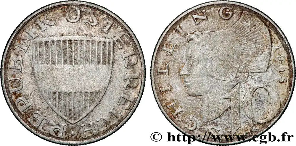 Type : 10 SchillingDate : 1959Quantité frappée : 4739500Métal : argentTitre en millième : 640 ‰Diamètre : 27 mmAxe des coins : 12 h.Poids : 7,49 g.Tranche : canneléeCommentaires sur l’état de conservation :Monnaie nettoyée, quelques rayuresRéférence ouvrage :KM20/2882 AversTitulature avers : REPUBLIK ÖSTERREICH..Description avers : écu de l’Autriche.Traduction avers : (République d’Autriche).ReversTitulature revers : 10 SCHILLING (DATE).Description revers : femme coiffée du goldhaube traditionnel du Wachau.HistoriqueAUTRICHE