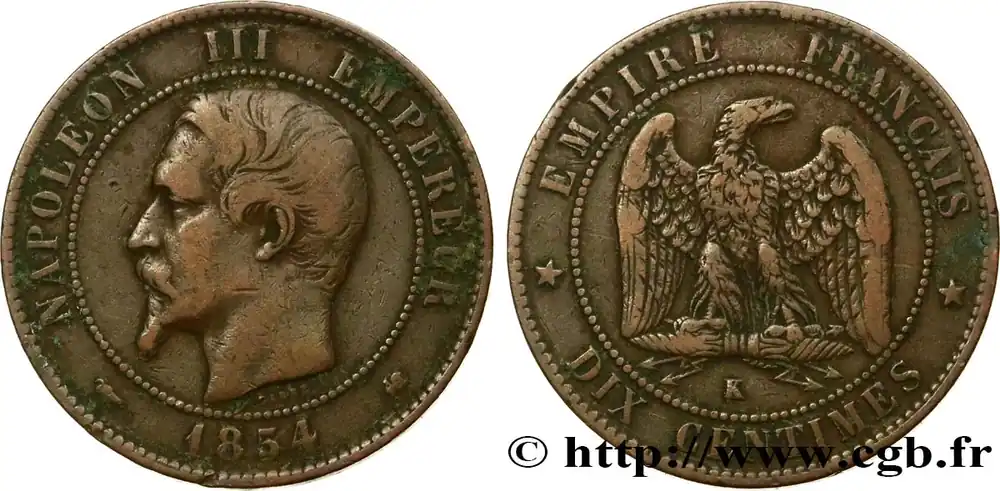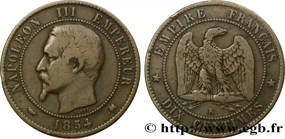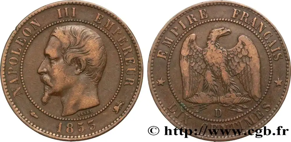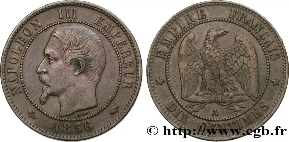 Type : Dix centimes Napoléon III, tête nueDate : 1855Nom de l’atelier/ville : LyonQuantité frappée : 8332994Métal : bronzeDiamètre : 30 mmAxe des coins : 6 h.Poids : 9,78 g.Tranche : lisseCommentaires sur l’état de conservation :Très légère patine verdâtreRéférence ouvrage :Classement FRANC 2023 / FRANC 2023 classificationF.133/26AversTitulature avers : NAPOLEON III EMPEREUR// (ANCRE) 1855 (MM).Description avers : Tête nue de Napoléon III à gauche ; signé BARRE au-dessous.ReversTitulature revers : EMPIRE FRANÇAIS// *DIX CENTIMES*.Description revers : Aigle debout de face sur un foudre, les ailes ouvertes, la tête tournée à droite ; au-dessous, D.CommentaireExemplaire avec le différent ancre.HistoriqueSECOND EMPIRE(02/12/1852-04/09/1870) Proclamé empereur sous le nom de Napoléon III, Louis Napoléon fait son entrée solennelle à Paris le 2 décembre 1852. Il épouse Eugénie Marie de Montijo, aristocrate espagnole, en janvier 1853. Son règne peut se diviser en trois périodes : l’Empire autoritaire jusqu’en 1860 ; l’Empire libéral de 1860 à 1870 puis l’Empire parlementaire en 1870. Durant l’Empire autoritaire, Napoléon III exerce son pouvoir sans partage, contrôle la presse tandis que les journaux pratiquent l’autocensure pour éviter leur suppression. Les préfets exercent une puissance illimitée dans les départements, les maires, les fonctionnaires sont nommés par le gouvernement. Comme sous le Premier Empire, l’Éducation et l’Université sont surveillées. Maintenant les grands principes de la révolution, la souveraineté du peuple est continuée grâce à la consultation par plébiscite. Sur le plan économique, l’essor est important, l’industrialisation se développe ainsi que les organismes de crédit et les grands magasins. Le prestige militaire est accru par la guerre de Crimée qui permet à la France de jouer un rôle international. L’attentat d’Orsini (janvier 1858) n’empêche nullement la France d’intervenir en Italie pour faire triompher le principe des nationalités et permet le rattachement de Nice et de la Savoie par le traité de Turin (mars 1860). Dès 1860, l’Empire évolue vers plus de libertés : traité libre-échangiste de commerce avec l’Angleterre, apparition d’une faible opposition dans le Corps législatif, octroi du droit de grève (1864), libéralisation de la presse (1868). Sur le plan international, la France acquiert la Nouvelle-Calédonie, la Cochinchine et encourage le creusement du canal de Suez par Ferdinand de Lesseps. Au Mexique, le soutien à Maximilien et à l’Autriche est toutefois un échec. Les élections de 1869 sont très mauvaises pour le régime et l’opposition obtient 45 % des voix. Le régime évolue alors vers un Empire parlementaire en appelant Émile Ollivier, chef du parti orléaniste et libéral, au pouvoir. Après Sadowa en 1866 où la Prusse écrase l’Autriche, l’affaire du trône d’Espagne et de la dépêche d’Ems entraînent la guerre qui est déclarée le 19 juillet 1870. Accumulant les revers, l’armée française est encerclée dans Metz puis Napoléon III, malade, capitule à Sedan le 2 septembre. Aussitôt la nouvelle connue, la déchéance de l’Empire est annoncée par Gambetta puis la République est proclamée le 4 septembre. Napoléon III est alors emmené en captivité en Hesse puis part dans le Kent où il meurt en 1873.