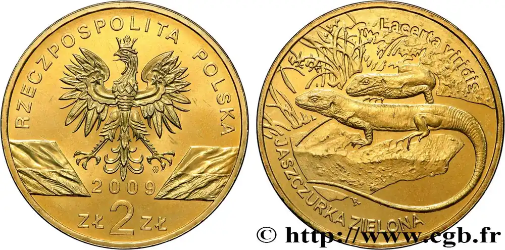 Type : 2 Zlote le lézard vert d’Europe (Lacerta viridis)Date : 2009Nom de l’atelier/ville : VarsovieQuantité frappée : 1700000Métal : cupro-aluminium ‘nordique’Diamètre : 27 mmAxe des coins : 12 h.Poids : 8,15 g.Tranche : inscrite en creux NBP ★ NBP ★ NBP ★ NBP ★ NBP ★ NBP ★ NBP ★ NBP ★ Référence ouvrage :KM21/678 AversTitulature avers : RZECZPOSPOLITA POLSKA // MW // 2009 / ZŁ 2 ZŁ .Description avers : emblème à l’aigle couronné entre deux drapeaux.Traduction avers : (République de Pologne // 2 Zlote).ReversTitulature revers : LACERTA VIRIDIS //JASZCZURKA ZIELONA .Description revers : deux lézards sur une pierre.HistoriquePOLOGNE