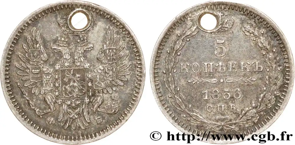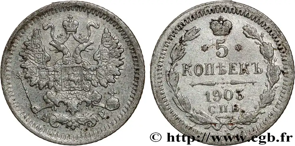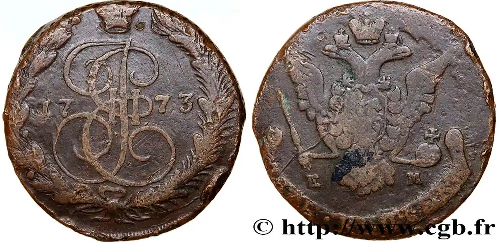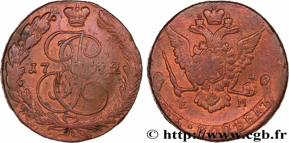 Type : 5 Kopecks Date : 1793Nom de l’atelier/ville : EkaterinbourgQuantité frappée : 22736000Métal : cuivreDiamètre : 44 mmAxe des coins : 12 h.Poids : 50,40 g.Tranche : macléeRéférence ouvrage :KM/WC.18/59.3 AversDescription avers : Monogramme de l’impératrice Catherine II, sous une couronne, dans une couronne végétale nouée en bas par un ruban ; de part et d’autre du monogramme la date.ReversTitulature revers : (LÉGENDE CYRILLIQUE).Description revers : Aigle bicéphale couronnée, sous une couronne, portant en cœur un évu ovale ; un sceptre et un globe crucigère dans les pattes ; au-dessous les lettres d’atelier.Traduction revers : (Cinq kopecks).HistoriqueRUSSIE – CATHERINE II(17/07/1762-17/11/ 1796) Catherine (2/05/1729-17/11/1796) fut la plus grande tsarine après Pierre le Grand. Elle succéda à son mari, Pierre III, qui fut déposé en 1762 avant d’être assassiné par les frères Orloff. Son très long règne fit entrer la Russie dans le « Siècle des Lumières ». Amie des philosophes dont Diderot à qui elle acheta sa bibliothèque, libérale, elle renforça néanmoins le despotisme et l’étatisation de la Russie. Elle lutta contre les Turcs et se montra une adversaire de la Révolution Française.