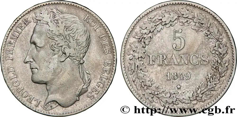Type : 5 Francs Léopold Ier tête lauréeDate : 1847Quantité frappée : 699601Métal : argentTitre en millième : 900 ‰Diamètre : 37 mmAxe des coins : 6 h.Poids : 24,55 g.Tranche : en reliefCommentaires sur l’état de conservation :Traces de nettoyageRéférence ouvrage :KM.19/3.2 – WELT.10 AversTitulature avers : LEOPOLD PREMIER ROI DES BELGES.Description avers : tête à gauche laurée de Léopold Ier.ReversDescription revers : valeur faciale “5 Francs” et date au centre d’une couronne de feuilles de chêne.HistoriqueBELGIQUE
