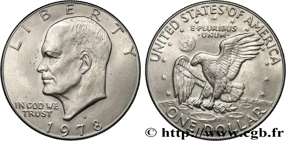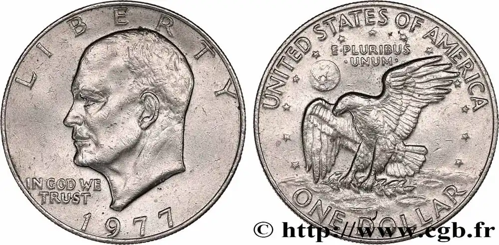 Type : 1 Dollar Eisenhower / aigle posé sur la LuneDate : 1974Nom de l’atelier/ville : DenverQuantité frappée : 45517000Métal : cupro-nickelDiamètre : 38,1 mmAxe des coins : 6 h.Poids : 22,56 g.Tranche : canneléeCommentaires sur l’état de conservation :Monnaie nettoyéeRéférence ouvrage :KM20/- – Y.- AversTitulature avers : LIBERTY // (DATE).Description avers : portrait à gauche de Dwight David Eisenhower et inscription à gauche dans le champ : IN GOD WE / TRUST.ReversTitulature revers : UNITED STATES OF AMERICA // ONE DOLLAR.Description revers : aigle aux ailes déployées tenant un rameau d’olivier ; au second plan sol lunaire et vue de la terre ; inscription en haut dans le champ : E.PLURIBUS / UNUM.HistoriqueÉTATS-UNIS D’AMÉRIQUE