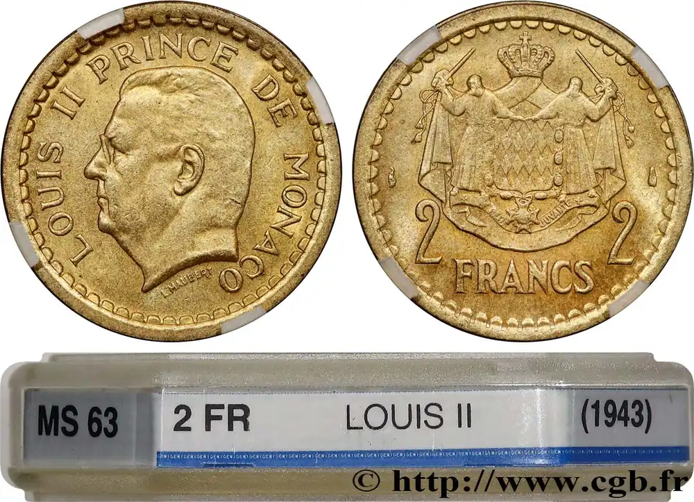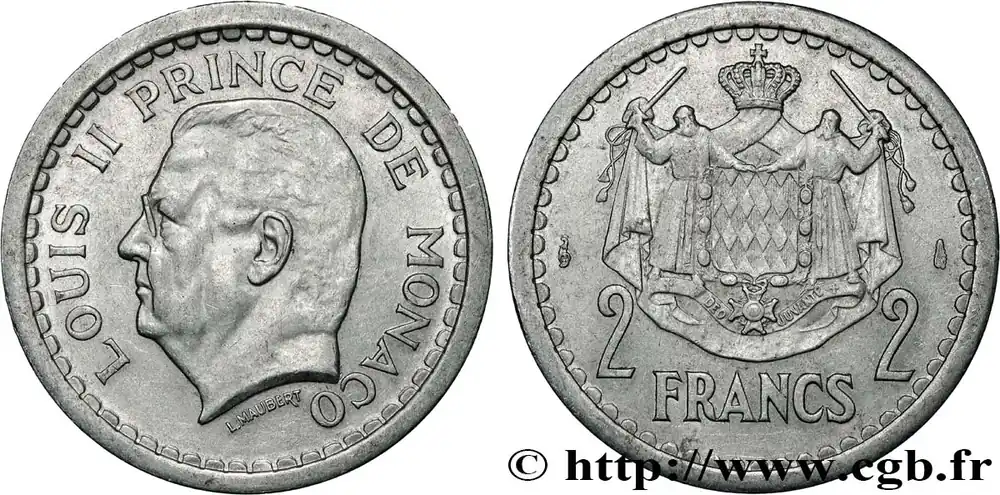 Type : 2 Francs Louis IIDate : 1943Nom de l’atelier/ville : ParisQuantité frappée : 1250000Métal : aluminiumDiamètre : 27 mmAxe des coins : 6 h.Poids : 2,22 g.Tranche : lisseCommentaires sur l’état de conservation :monnaie nettoyéeRéférence ouvrage :G.2019.133 – KM20/121 AversTitulature avers : LOUIS II PRINCE DE MONACO.Description avers : Tête à gauche de Louis II ; signé L. MAUBERT.ReversTitulature revers : 2 – 2/ FRANCS.Description revers : Écu aux armes des Grimaldi soutenu par deux moines posé sur un manteau couronné.CommentaireMonnaie non datée ; l’aluminium n’a été frappé qu’en 1943.HistoriqueMONACO