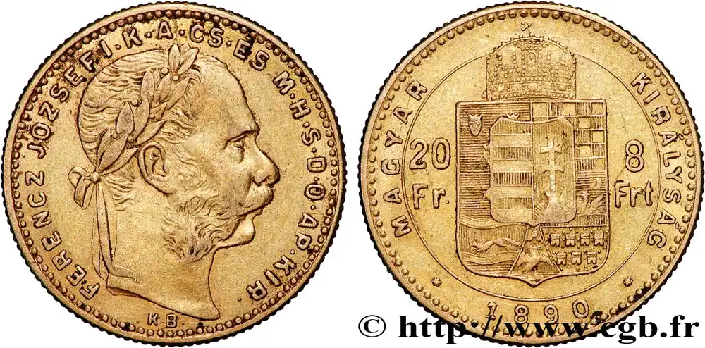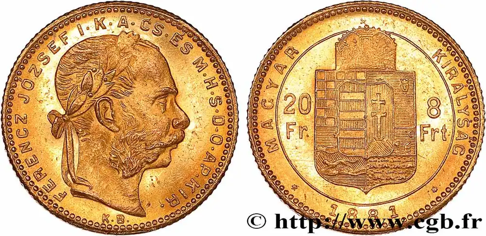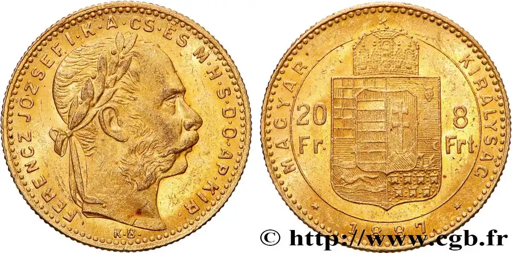Type : 20 Francs or ou 8 Forint François-Joseph IerDate : 1874Nom de l’atelier/ville : KremnitzQuantité frappée : 240359Métal : orTitre en millième : 900 ‰Diamètre : 21 mmAxe des coins : 12 h.Poids : 6,44 g.Tranche : canneléeCommentaires sur l’état de conservation :Traces de nettoyageRéférence ouvrage :KM.19/455.1 AversTitulature avers : FERENCZ JOZSEF I. K. A. CS. ES. M. H. S. D. O. AP. KIR..Description avers : Tête laurée de François-Joseph Ier à droite ; KB sous la tête.ReversTitulature revers : MAGYAR – KIRALYSAG/ 1874.Description revers : Écu couronné surmonté de la couronne de saint André ; dans le champ 20/ Fr – 8/ Frt.Traduction revers : (Royaume de Hongrie).Commentairej.HistoriqueOR, PALLADIUM ET PLATINE INVESTISSEMENTSécurisez et diversifiez votre épargne avec les métaux précieux :Dans un contexte d’instabilité politique et économique croissante, diversifier son épargne peut être une démarche judicieuse. Les métaux précieux comme l’or, le palladium et le platine constituent des actifs tangibles souvent prisés en raison de leur caractère intemporel et de leur résilience face aux fluctuations des marchés.Pour répondre à des besoins variés, l’achat de pièces officielles en or, palladium ou platine est une option flexible et adaptée. Ces pièces, disponibles à l’unité ou en lot, permettent à chacun d’ajuster ses choix selon ses objectifs et son budget, sans engagement à long terme.Un processus simple et sécurisé :Nous proposons une livraison sécurisée et garantie. Les paiements peuvent être effectués par carte bancaire ou par virement, bien que certaines transactions puissent nécessiter un règlement exclusivement par virement bancaire. Une pièce d’identité valide (carte nationale d’identité ou passeport) sera demandée pour finaliser votre achat.Stockage en toute sécurité et confidentialité :Le département Investissement de CGB Numismatique Paris met à votre disposition des solutions de stockage offrant une sécurité renforcée et une confidentialité optimale pour vos achats en or, palladium et platine.Contactez-nous pour plus d’informations :Pour toute question ou pour passer commande, prenez contact avec notre responsable des achats/ventes de métaux précieux : par email à [email protected] ou par téléphone. Nous mettons à votre disposition des informations générales et des services pour vous accompagner dans vos projets d’investissement.CGB Numismatique Paris agit en tant que fournisseur de métaux précieux et ne fournit aucun conseil en investissement. La valeur des métaux précieux peut fluctuer, et les performances passées ne garantissent pas les résultats futurs. L’achat de métaux précieux doit être considéré comme une stratégie de préservation de valeur plutôt qu’un investissement spéculatif. Conformément à l’article L.221-28 du Code de la consommation, le droit de rétractation ne s’applique pas aux achats d’or d’investissement, dont le prix dépend des fluctuations des marchés financiers.