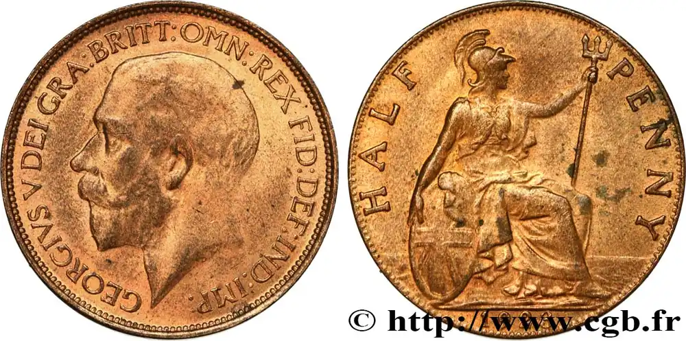 Type : 1/2 Penny Georges VDate : 1916Quantité frappée : 39386100Métal : bronzeDiamètre : 25 mmAxe des coins : 12 h.Poids : 5,55 g.Tranche : lisseRéférence ouvrage :Sp.4056 – KM20/809 AversTitulature avers : GEORGIVS V DEI GRA:BRITT:OMN:REX FID:DEF:IND:IMP.Description avers : Buste couronné à gauche de Georges V.Traduction avers : (Georges V Roi de toutes les Bretagnes par la grâce de Dieu Défenseur de la foi, Empereur des Indes).ReversTitulature revers : HALF PENNY/ 1916.Description revers : Britannia assise à droite.HistoriqueROYAUME-UNI