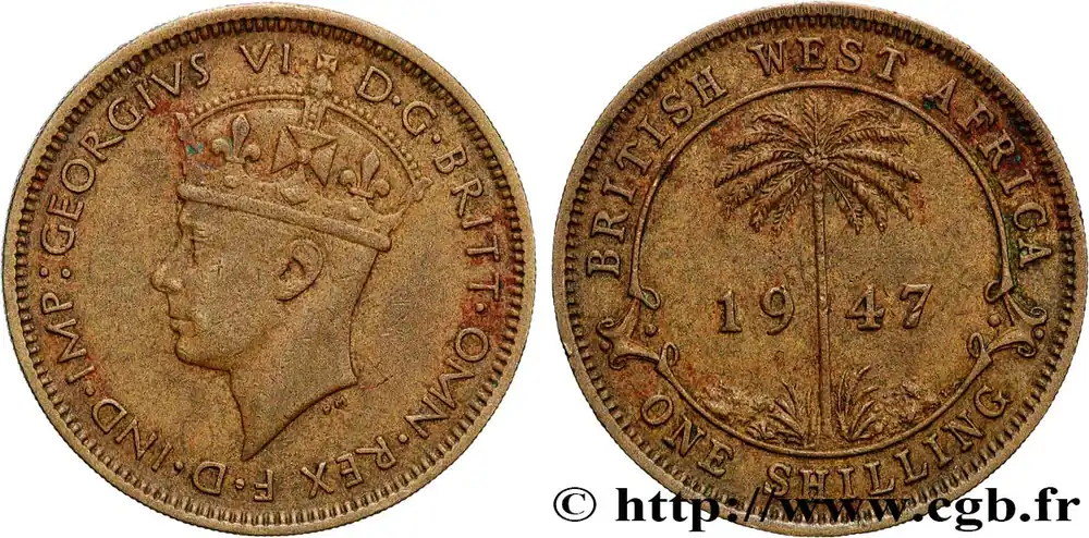 Type : 1 Shilling Georges VIDate : 1947Nom de l’atelier/ville : Kings NortonQuantité frappée : 10384000Métal : nickel-laitonDiamètre : 23,5 mmAxe des coins : 12 h.Poids : 5,51 g.Tranche : tranche de sécuritéRéférence ouvrage :KM20/23 AversTitulature avers : :GEORGIVS VI D·G·BRITT·OMN·REX F·D·IND·IMP // PM.Description avers : Portrait couronné à gauche du roi Georges VI.ReversTitulature revers : BRITISH WEST AFRICA // . 19 47 . // ONE SHILLING.Description revers : Palmier.CommentaireIntroduite en 1907, la Livre Ouest-Africaine circulait dans les colonies britanniques de l’Afrique de l’ouest : Nigeria, Gambie, Côte de l’Or (Ghana) et Sierra Leone. Elle était égale à la Livre Sterling et a circulé jusqu’en 1958 au Ghana et 1968 en Gambie..HistoriqueAFRIQUE OCCIDENTALE BRITANNIQUE