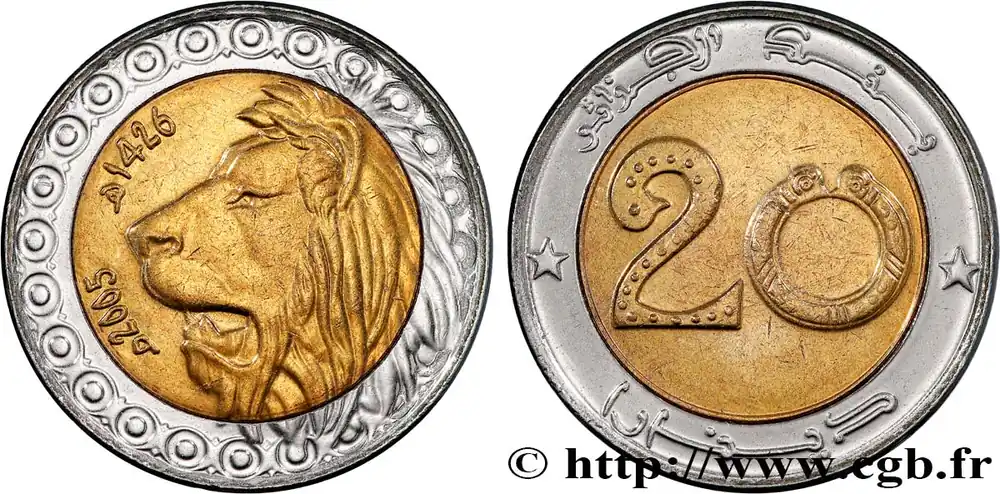 Type : 20 Dinars tête de lion an 1426Date : 2005Quantité frappée : -Métal : bimétalliqueDiamètre : 27,5 mmAxe des coins : 6 h.Poids : 8,62 g.Tranche : lisseRéférence ouvrage :KM21/125 AversTitulature avers : 1426 – 2005.Description avers : tête de lion à gauche.ReversTitulature revers : (LÉGENDE EN ARABE).Description revers : 20 dans le champ.HistoriqueALGÉRIE